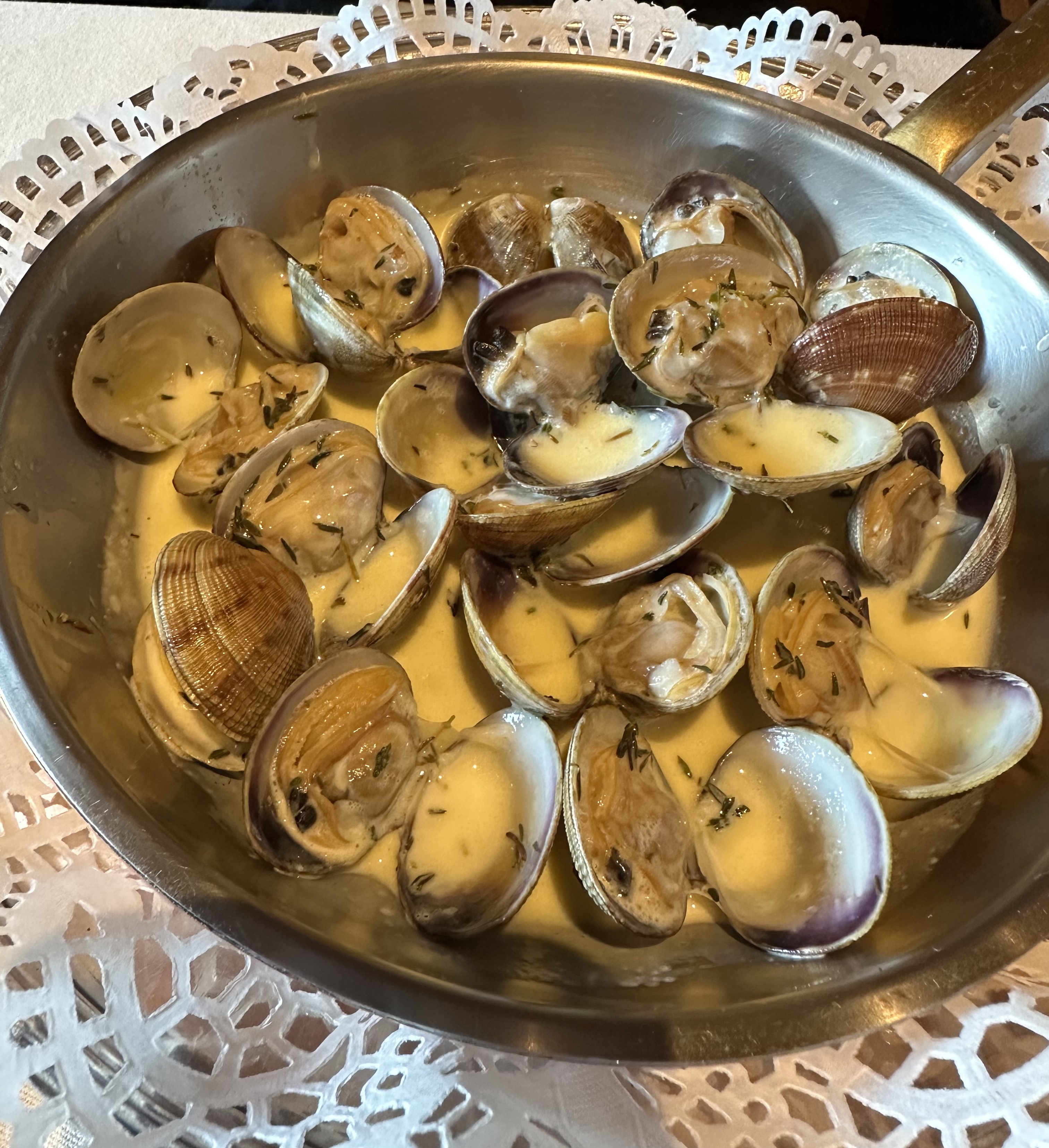 90 euros pour 4 petites palourdes ? Et ils n'étaient pas si bons que ça ! J'ai attendu 30 minutes avec un groupe de 20 personnes pour avoir du vin après m'être assis ???? Ouah!!! Et ils ont oublié de servir les 3 séries de purée de pommes de terre jusqu'à ce que je me lève et pose des questions à leur sujet. Et j'ai même oublié de demander plus de vin après que nous étions tous vides. Je ne reviendrai plus jamais