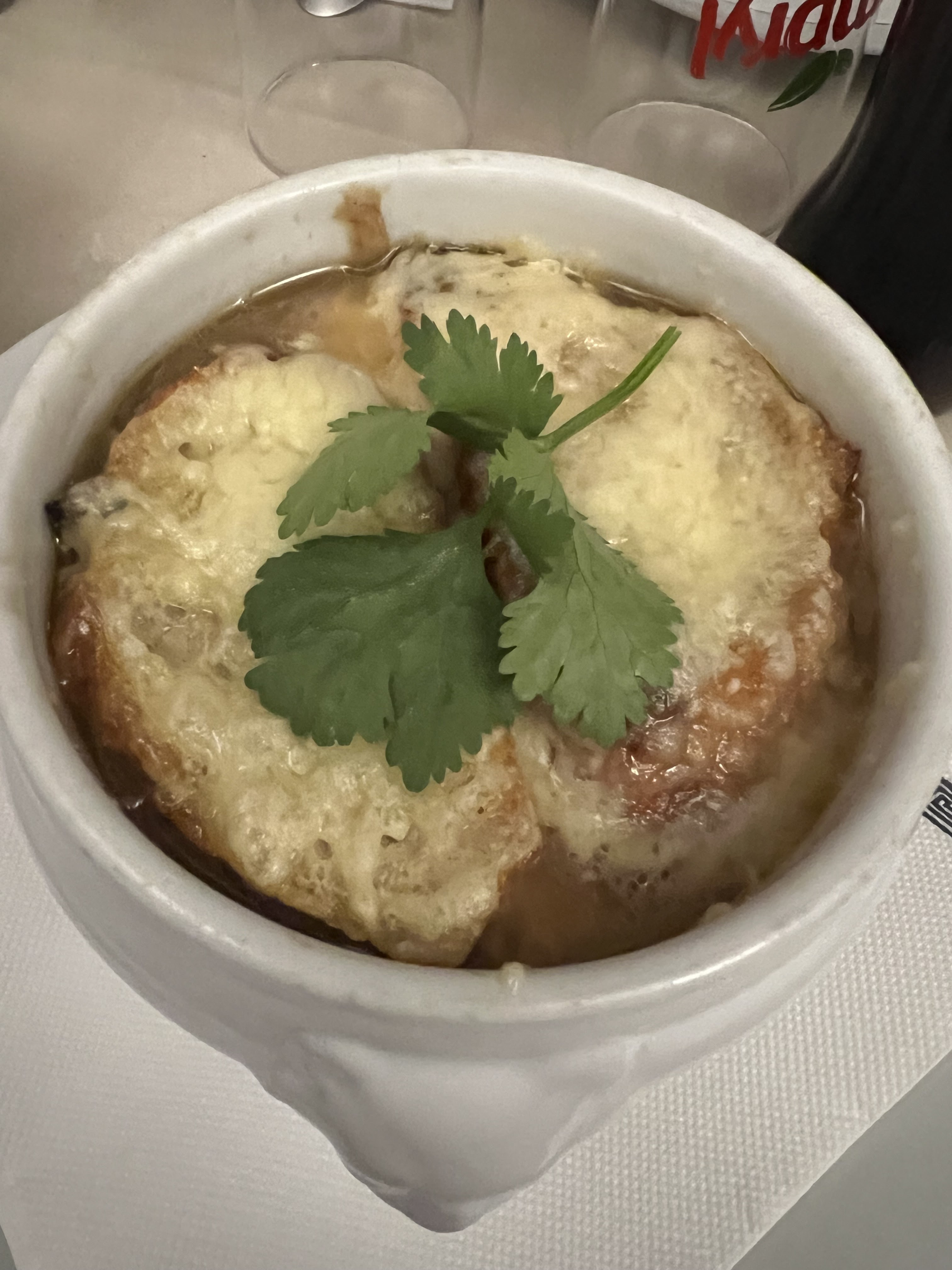 Malheureusement, c'est un piège à touristes… Je donne rarement de mauvaises critiques comme ça mais je dois le faire… Le personnel était sympathique mais la nourriture était horrible… La « soupe à l'oignon gratinée », n'était pas gratinée comme vous pouvez le voir sur la photo. Ce plat est censé être très savoureux mais c'était clairement du fromage de mauvaise qualité, la soupe avait très peu de goût. Nous avons ensuite eu le « confit de canard » qui est censé être tendre et juteux. La viande était si sèche et dure, et ils ont mis du pesto dessus… ! Les pommes de terre étaient comme celles surgelées qu'on achète au supermarché… ! Quel dommage… Mon coca cola est arrivé déjà ouvert sans bulles… ! Les sièges étaient sales et il y avait plein de petites mouches à l’intérieur du restaurant… A éviter malheureusement