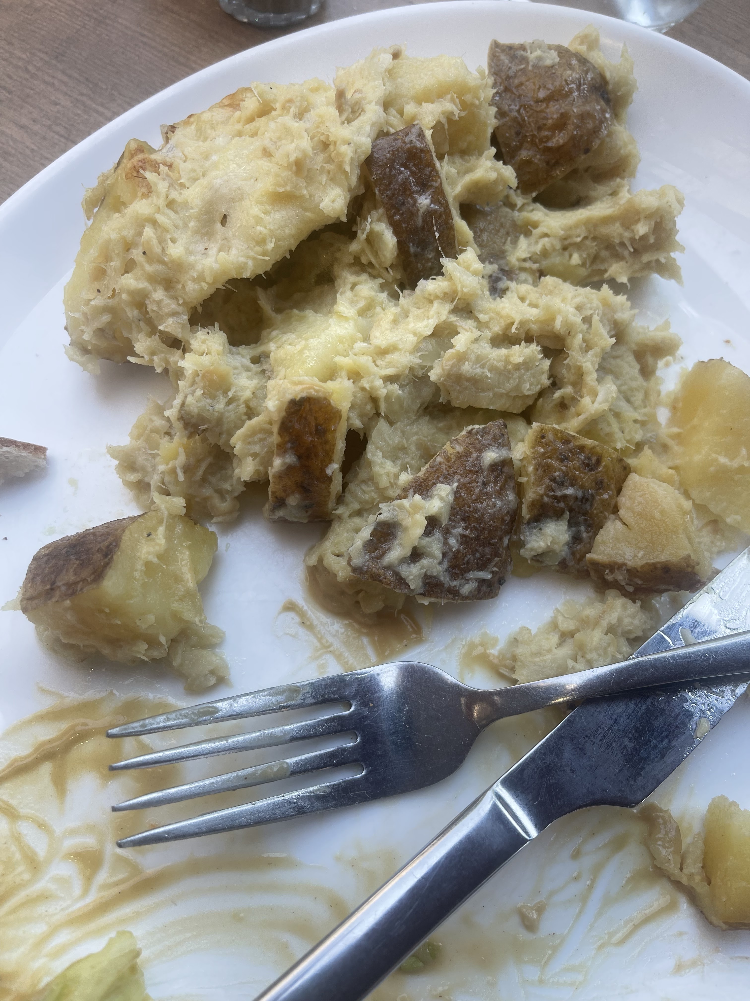 Plat à la morue écœurant. Pomme de terre de mauvaise qualité avec sa peau, juste dégueulasse. J’ai pourtant dû payer le plat même si je ne l’ai pas consommé. Dégoûtant