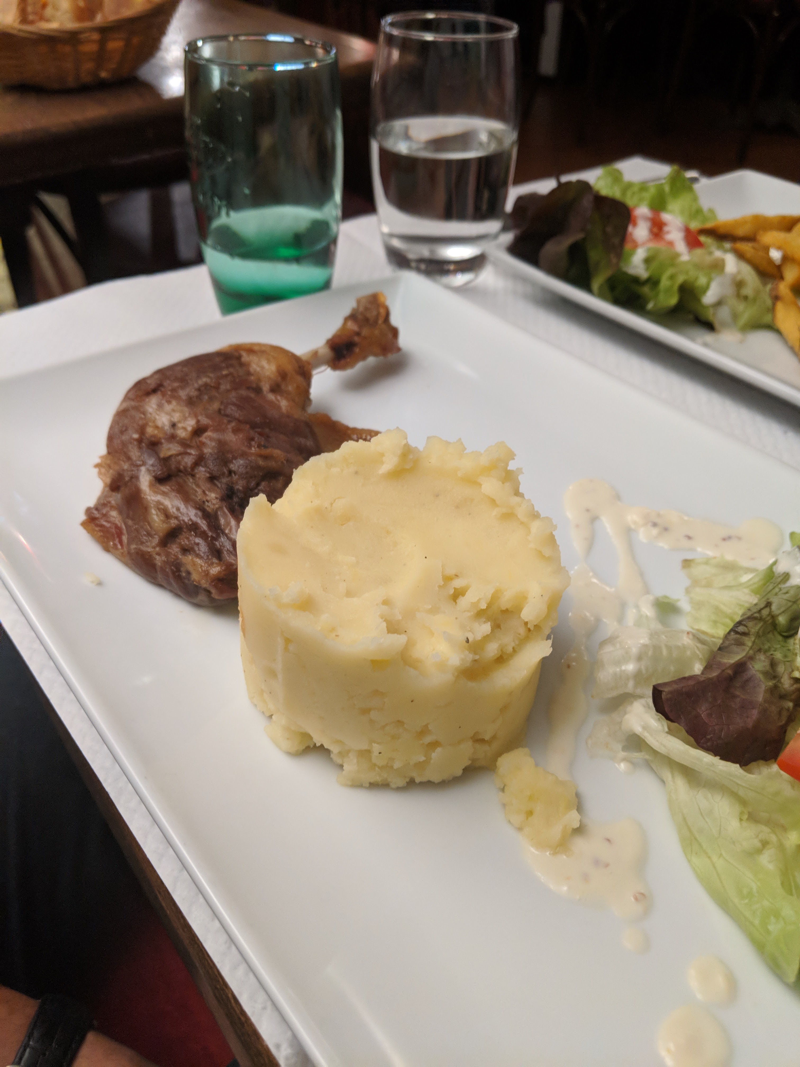 Évitez de manger ici. Nous cherchions juste un endroit où manger le confit de canard. De l'extérieur, l'endroit avait l'air plutôt bien et accueillant, le personnel était très sympathique. Une fois à l’intérieur nous nous asseyons, il y avait quelques mouches sur la table la plus proche… L'endroit avait l'air un peu sale mais nous avons quand même décidé de rester… J'ai commandé une soupe à l'oignon gratiné sans goût et sans gratin… Puis le confit de canard (canard cuit dans la graisse) très dur avec une sauce bizarre dessus, un truc genre pesto (?)… Les pommes de terre rôties qui accompagnaient le canard étaient dures et à moitié frites ou quelque chose du genre… Boissons : le Cola semblait scellé mais sans bulles… On aurait dit un piège à touristes…