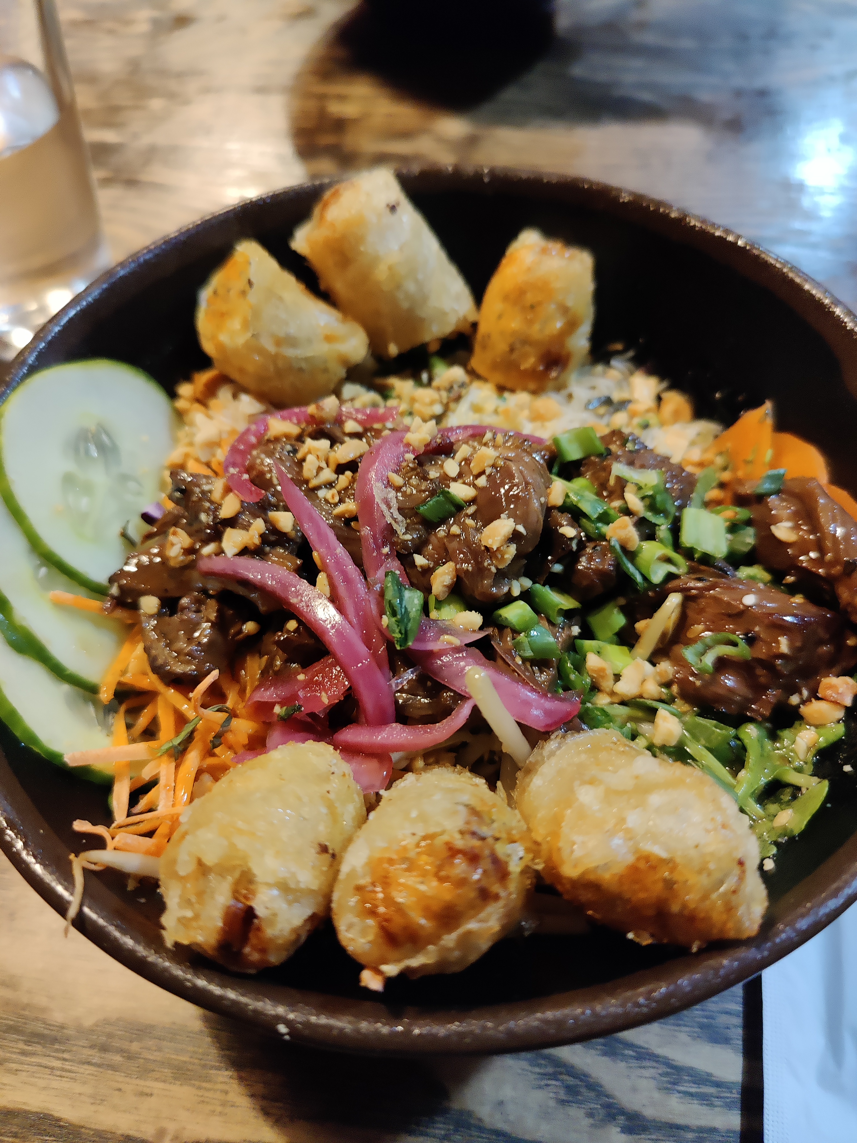 Très sympa, super déco, personnel agréable. Petit bémol sur la carte affichée il n'est pas mentionné la présence de viande (porc) dans un bowl aux crevettes.