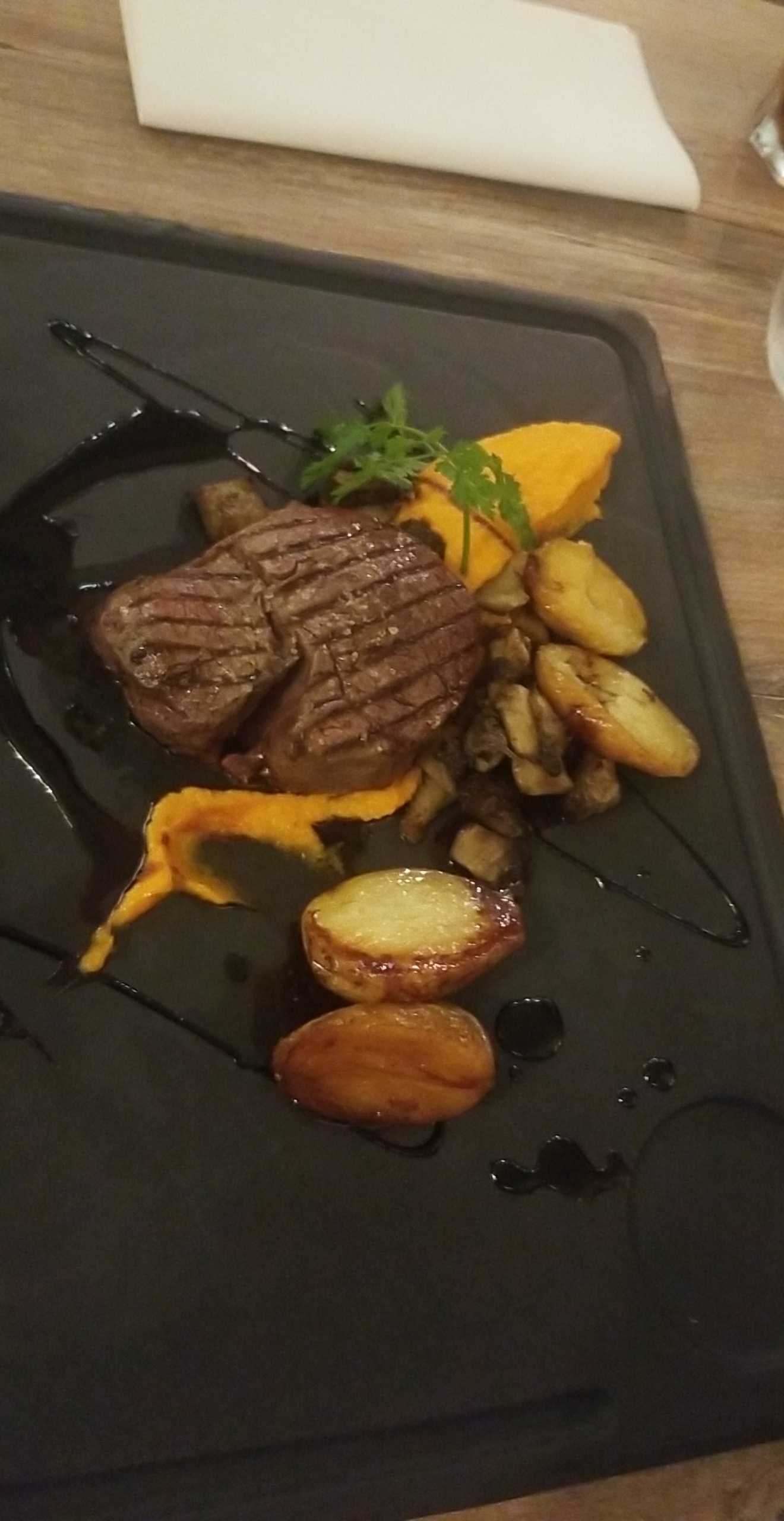 Entrée plat dessert sur la même lignée : délicieux !une cuisson parfaite , très bien assaisonné, savoureux mélanges et harmonie des ingrédients sublimé par un service de qualité et rapide.