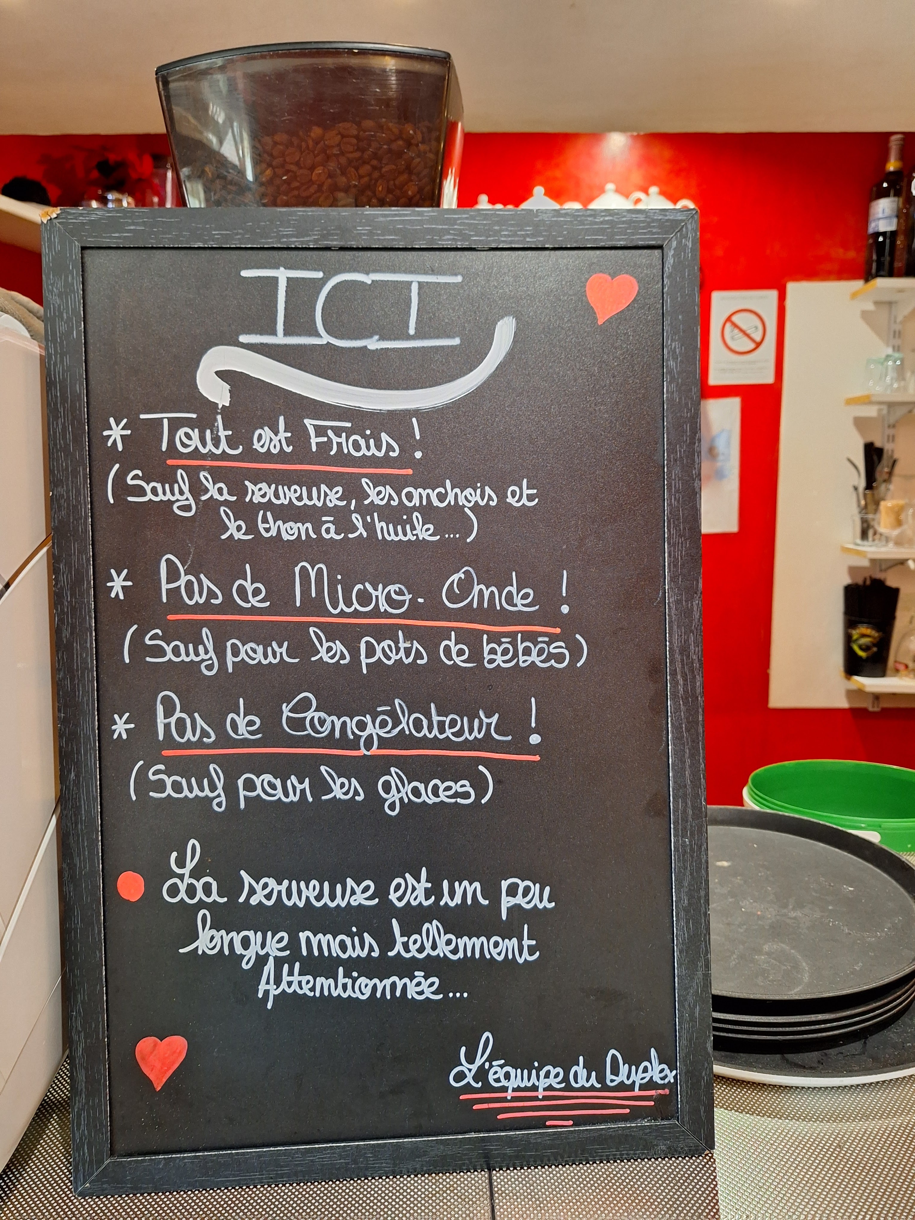 Accueil pétillant, menu unique à 14.90€ entrée plat dessert et petite terrasse à l'ombre : de bons ingrédients pour un bon moment passé au Duplex ! Madame est seule, en cuisine et au service mais .. quel peps !! Merci pour ce bon moment !