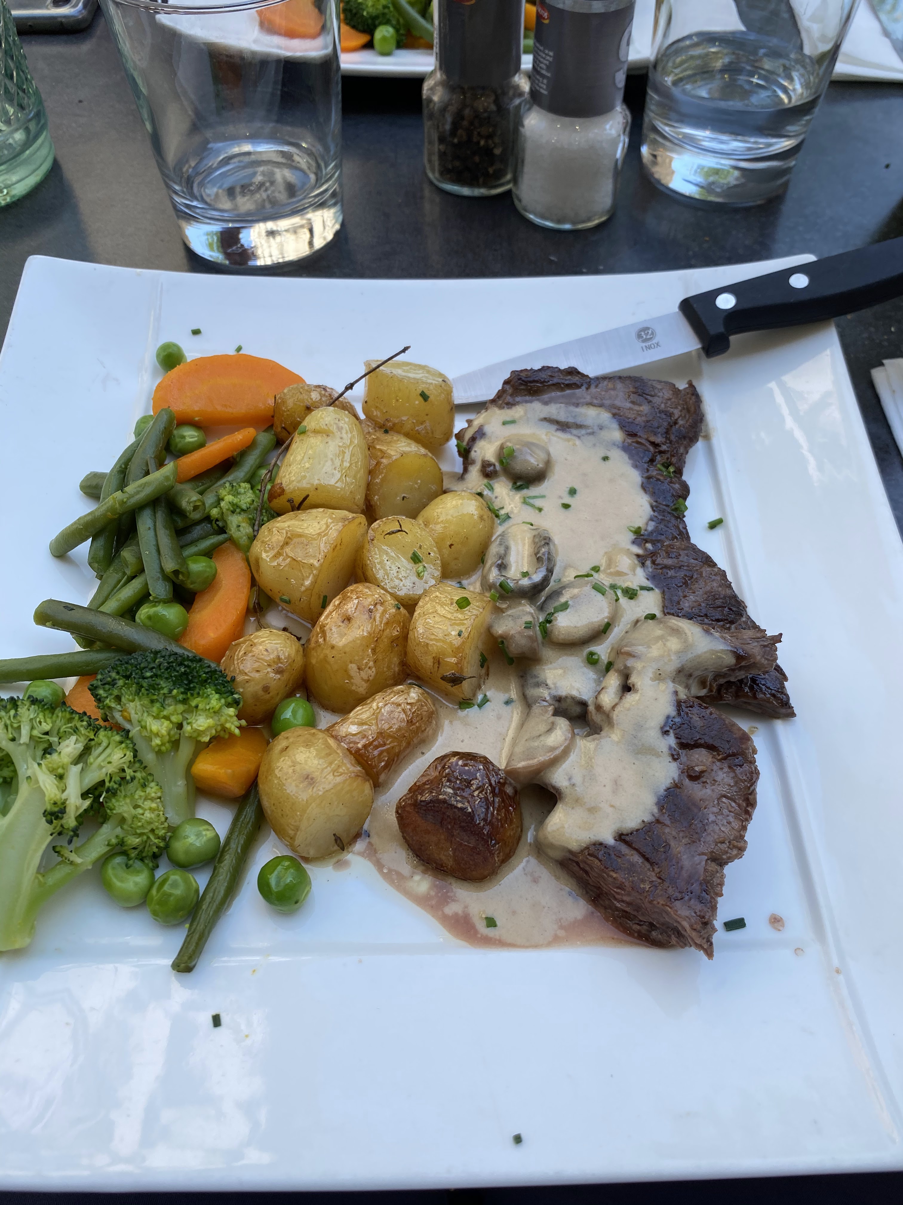 La nourriture était excellente - j'avais le menu fixe (entrée + plat à 21 €). La soupe aux champignons était délicieuse, noisette et savoureuse. Le steak était délicieux aussi, la purée de pommes de terre crémeuse et la sauce aux champignons était l'une des meilleures que j'ai goûtées, pas fade du tout et savoureuse et complimentait vraiment le steak. Le seul problème c'est que le menu est un QR code et heureusement j'avais Internet. Je ne sais pas s'ils ont un menu physique. Alors pour les touristes, faites attention. Mais je suis sûr que le personnel se fera un plaisir de vous aider, il est sympathique et le service était bon. Dans l'ensemble, abordable et je le recommande.