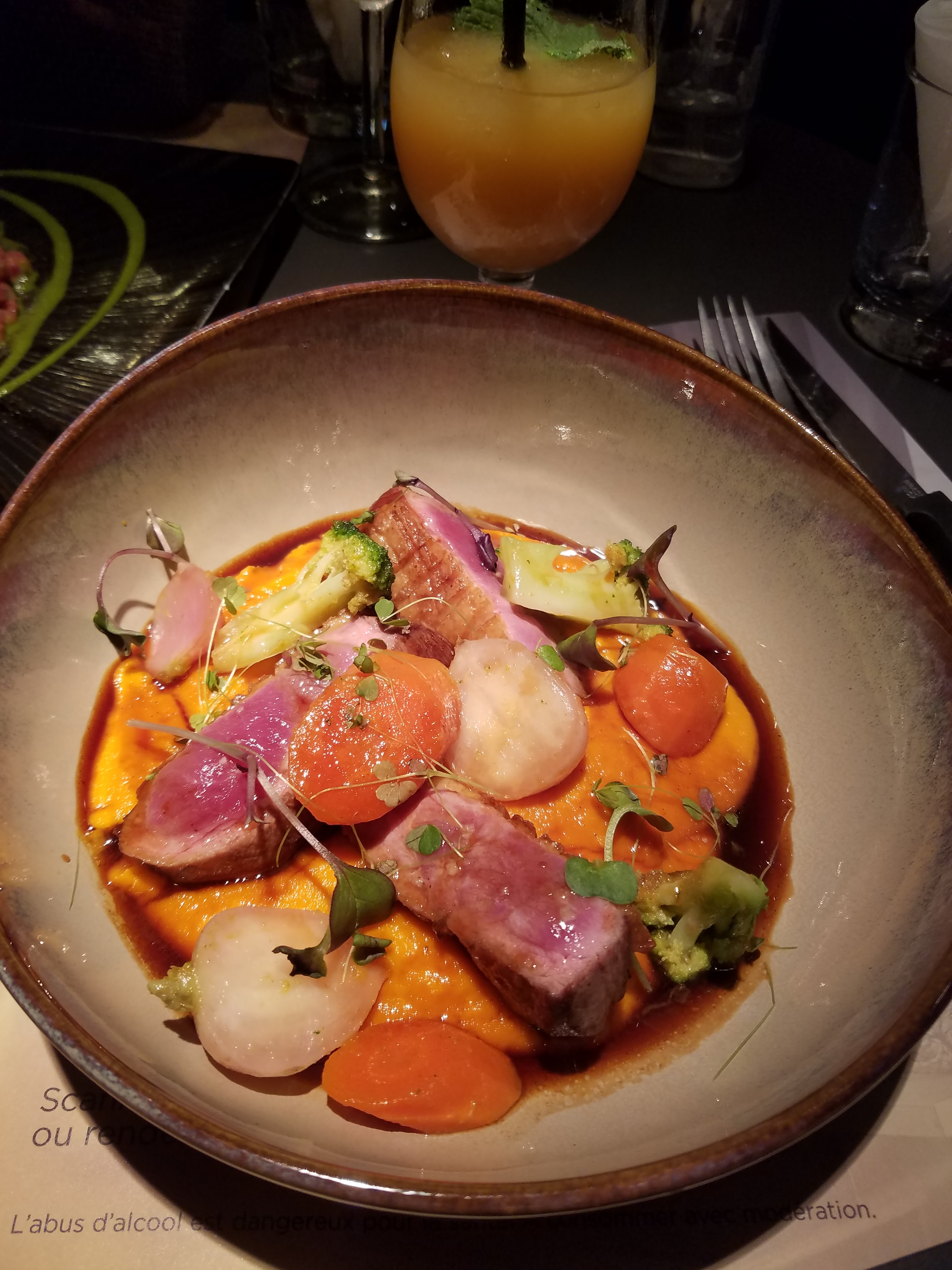 Excellente découverte. Très bonne cuisine, serveurs sympas, très beau cadre (et la vue sur l’hôtel Dieu illuminé), bref, je reviendrai. Mes collègues étaient ravis également. Merci et bravo