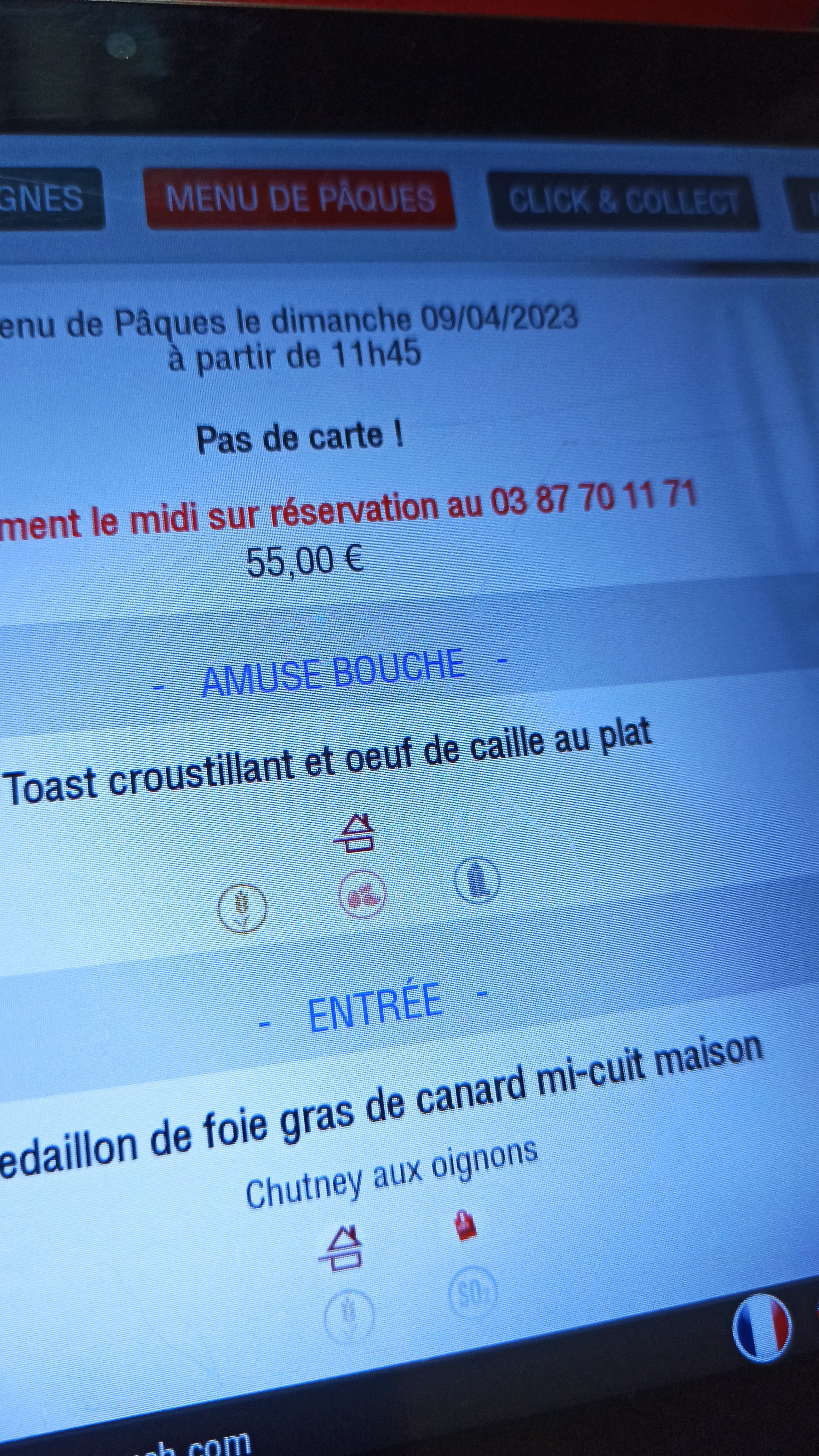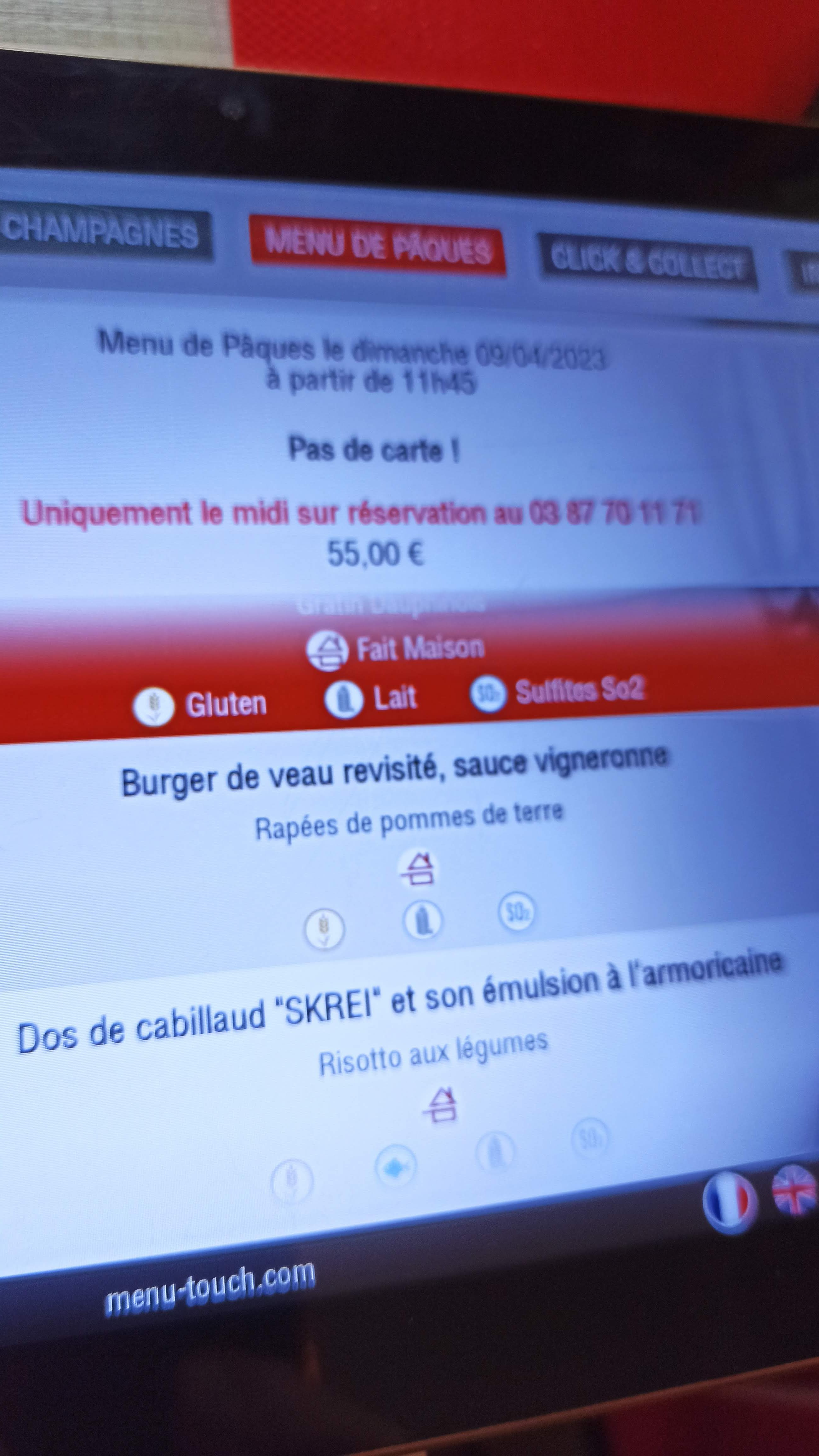 J'aurai bien mis 5 étoiles, car repas excellent comme d'habitude, très bonne cuisine! MAIS!, ce soir le service tout du moins la personne qui s’occupait de nous était très mal en point, éternuements, toux excessive à moins de 40 cm du visage et du reste ce trouvant sur la table, sans mauvaise fois aucune je n’exagère pas sur la distance, vous dire, j'ai presque cru à un gag les 10 premières minutes tellement c’était juste hallucinant! nous n'étions qu'a un doigt de partir au moment ou les plats sont arrivés, on a mangé de très bonnes choses tout en étant écœurés de la situation sanitaire au vue de ce qu'il se passe actuellement! Employé(e) venu(e) travailler de son plein gré ou sous pression hiérarchique ce que nous avons vécus ce soir est inacceptable, nous venons pour nous détendre, pas pour être malade. Rhume, bronchite, Covid ou autre, nous n'apprécions que très moyennement de faire partis d'une soirée cluster petites précisions qui a son importance: suite à une réflexion de notre part, nous avons été pris en charge par un(e) autre employé(e) et la fin du dîner s'est très bien passé malgré le fait que notre conversation se soit centralisé sur ce désagrément. Table 110 - 03/06/2022 - 20h30