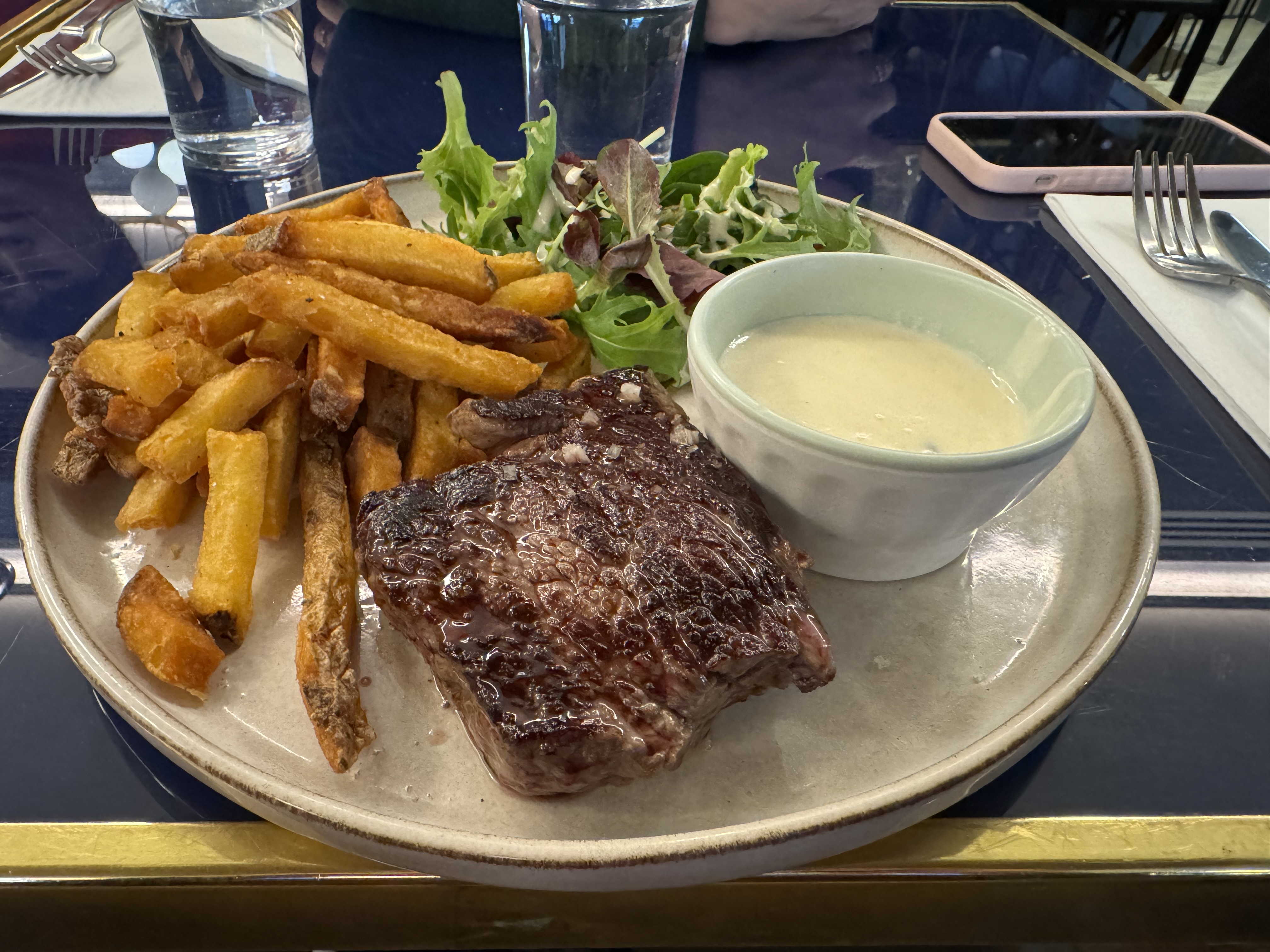 Nous étions à Paris pendant 5 jours et le restaurant se trouvait à proximité de notre appartement. Nous avons commandé deux fois l'entrecôte avec du fromage bleu et des frites. C'était incroyablement bon. 🙂