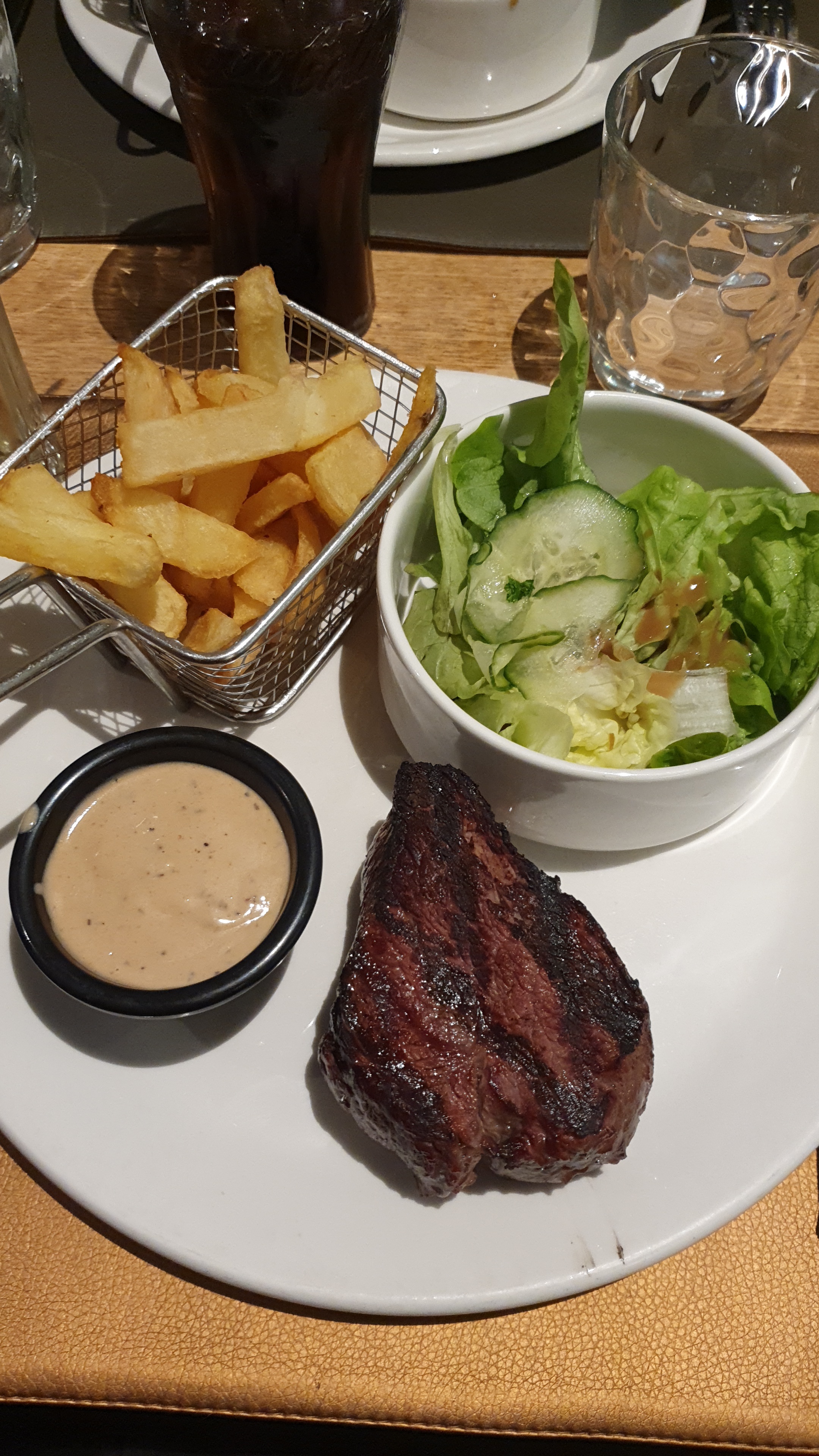 Filet de bœuf excellent. Garniture au choix : salsifis, gratin de chou fleur, pommes de terre grenaille, salade. Ça change des frites 😀