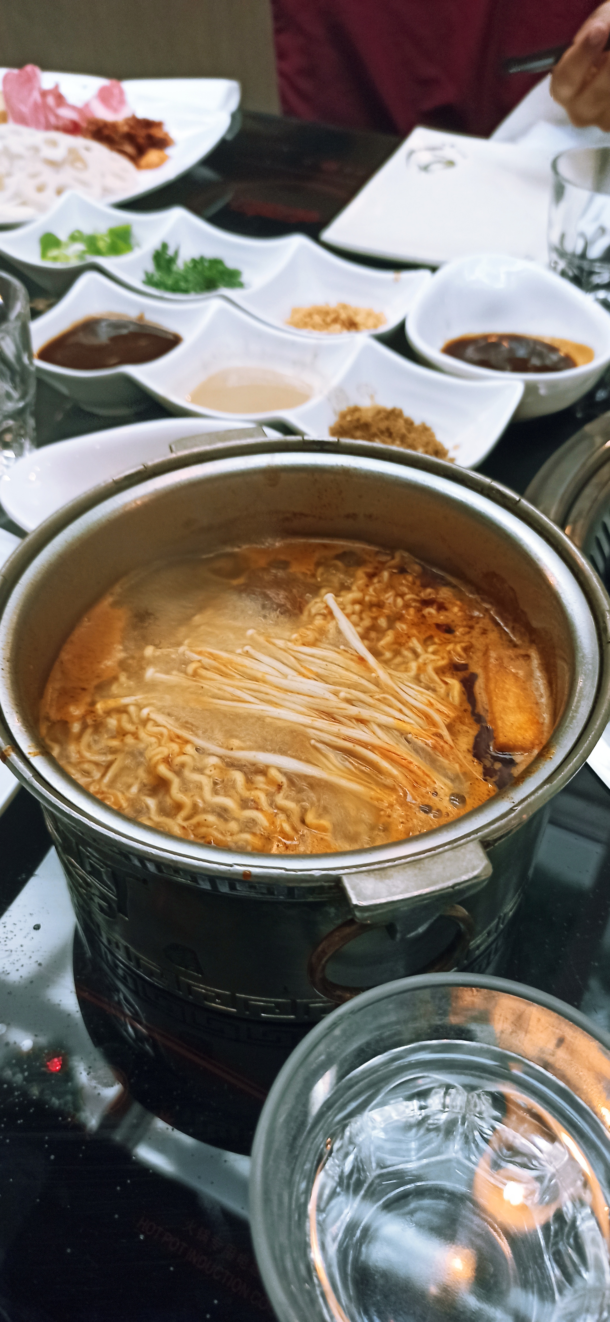 Superbe fondue chinoise ou hotpot. Tout est à volonté. Les marmites sont individuelles et on peut même y ajouter la fonction barbecue. Le poulet en entrée est une tuerie !
