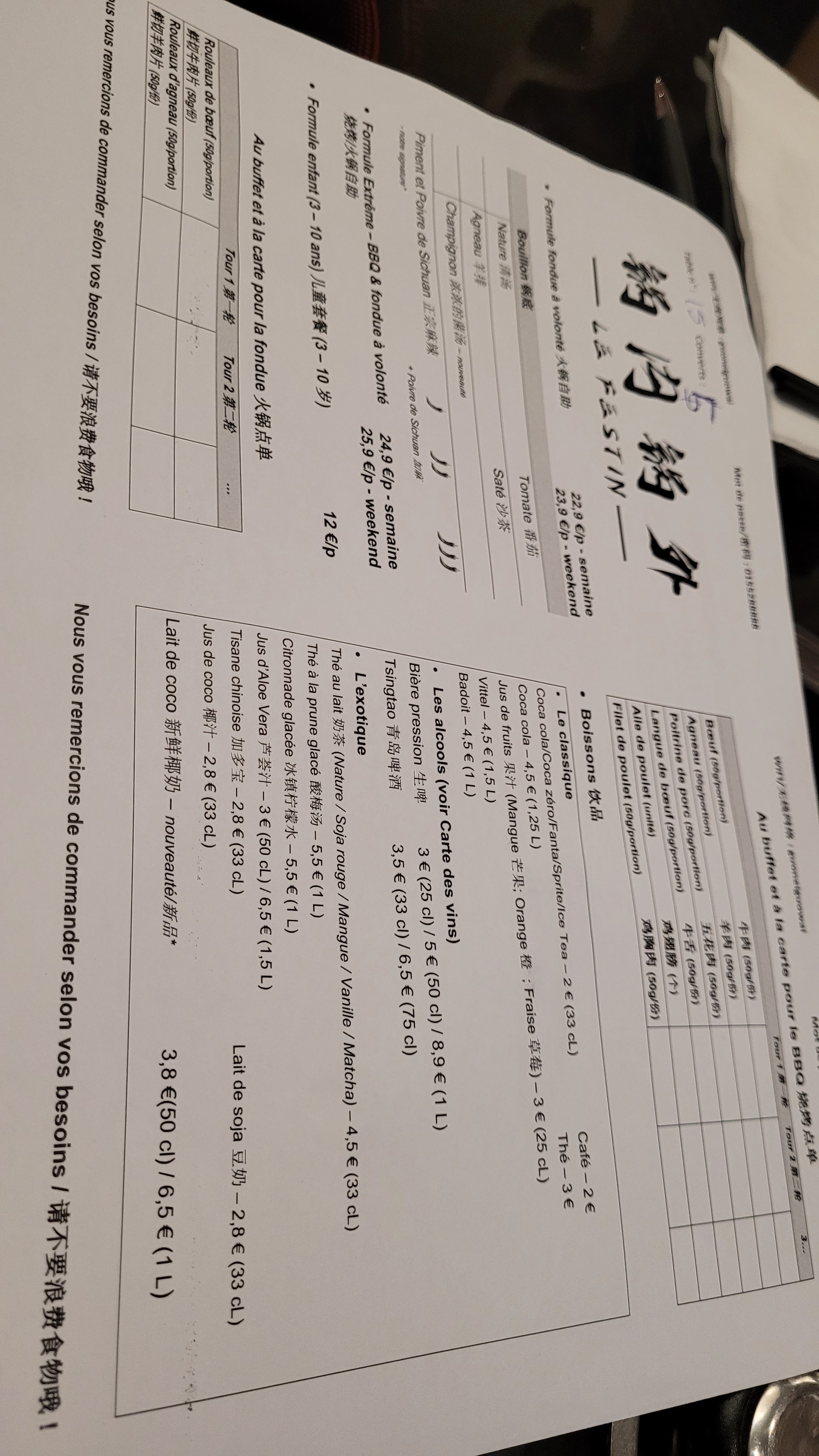 Nous avons bien mangé avec l'option hot pot + barbecue et chacun à sa soupe pour le hot pot!J'enlève 1 étoile pour la propreté générale car dans le coin où nous étions le sol était super glissant comme s'il y avait de la graisse et il y avait des cloques sur le mur.