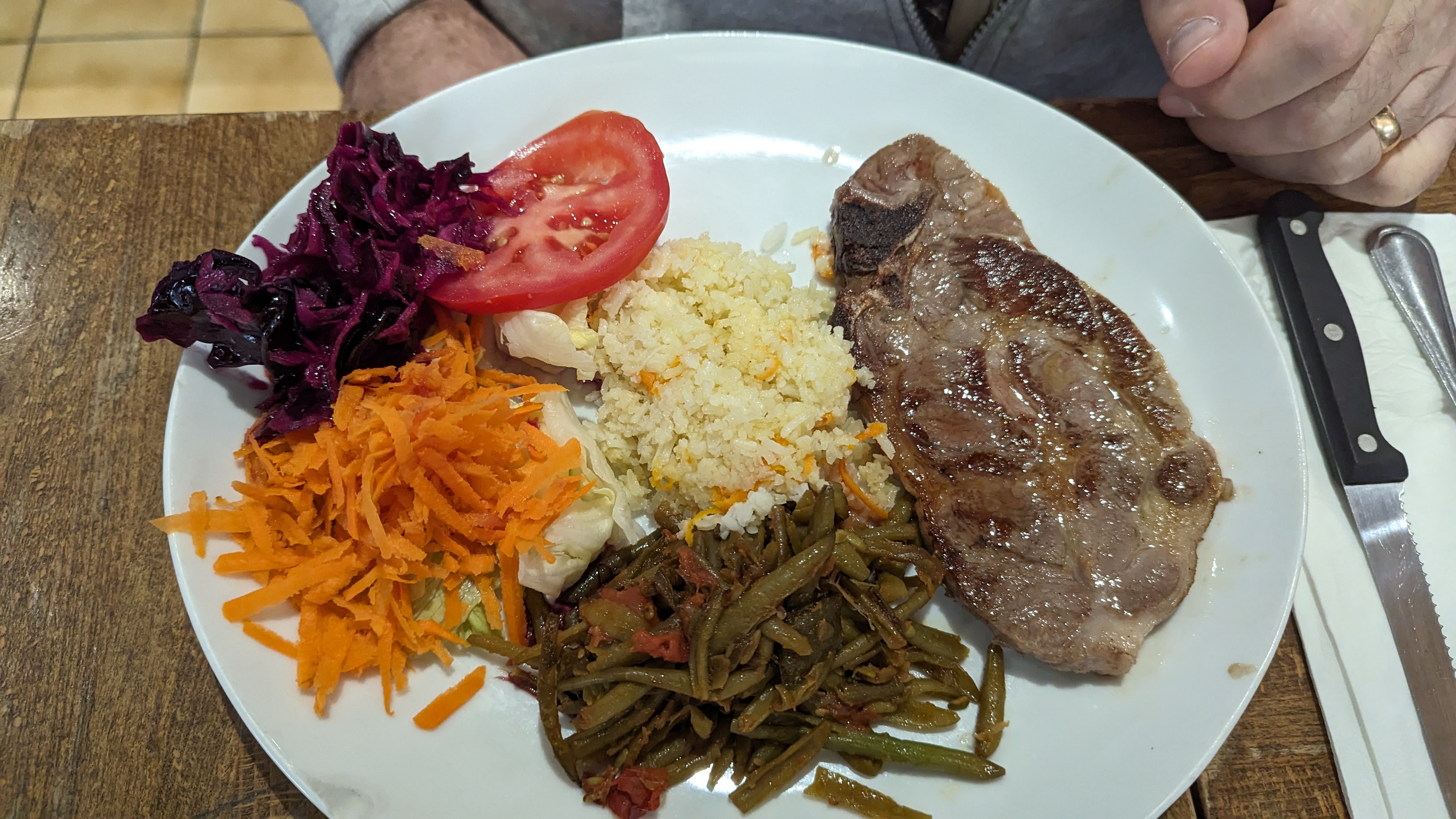 Il n'y a pas de carte, on comprend que le menu dépend des plats que peut proposer le restaurant. Prix pas cher pour des plats copieux et colorés. Pour petite faim, l'entrée suffit mais au regard des plats servis ça vaut le coup d'y goûter : viande excellente. La viande est juteuse, on sent bien que ce n'est pas cuit à la va vite... aujourd'hui le plat est à 11€. L'entrée ou le dessert sont à 4€ (même le café gourmand). Venu à cause des précédents avis, effectivement pour une 1ere fois, je recommande aussi !!!