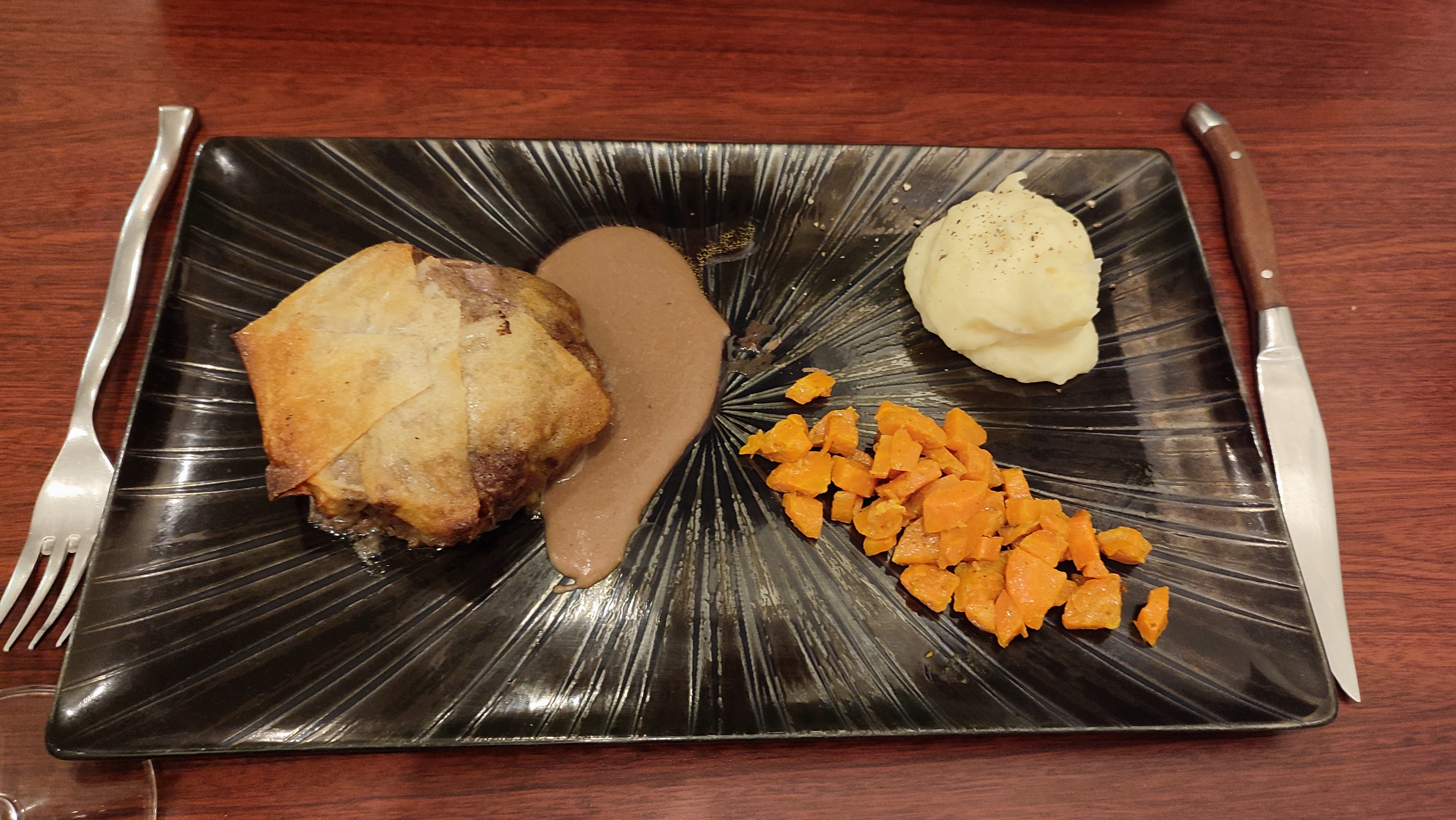 L'entrée et le plat principal correct ; le dessert banal et minuscule servi ds une grande assiette est décevant .