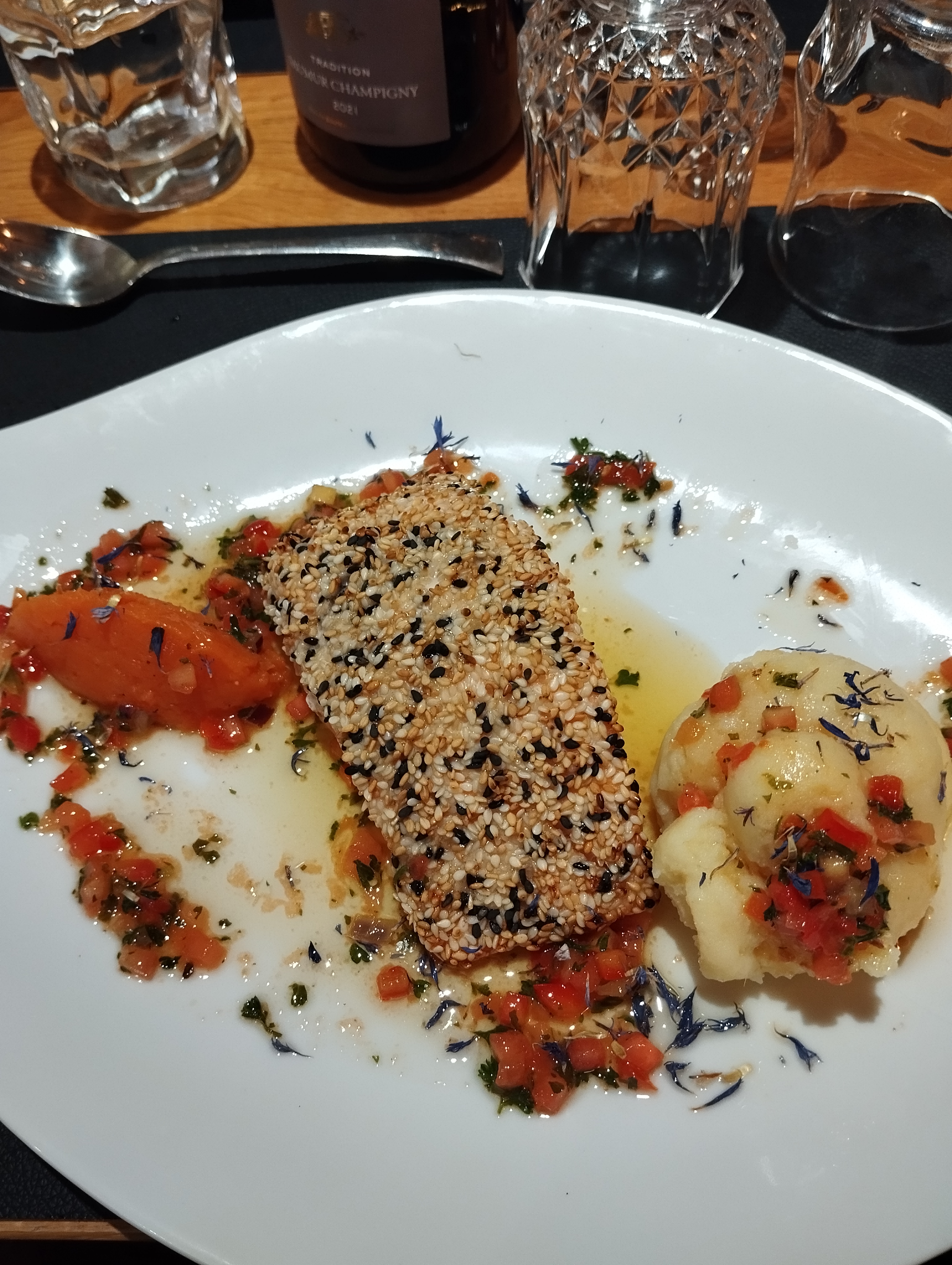 Un pavé de saumon rôti aux graines de sésames avec sa sauce vierge fantastique au niveau du goût.