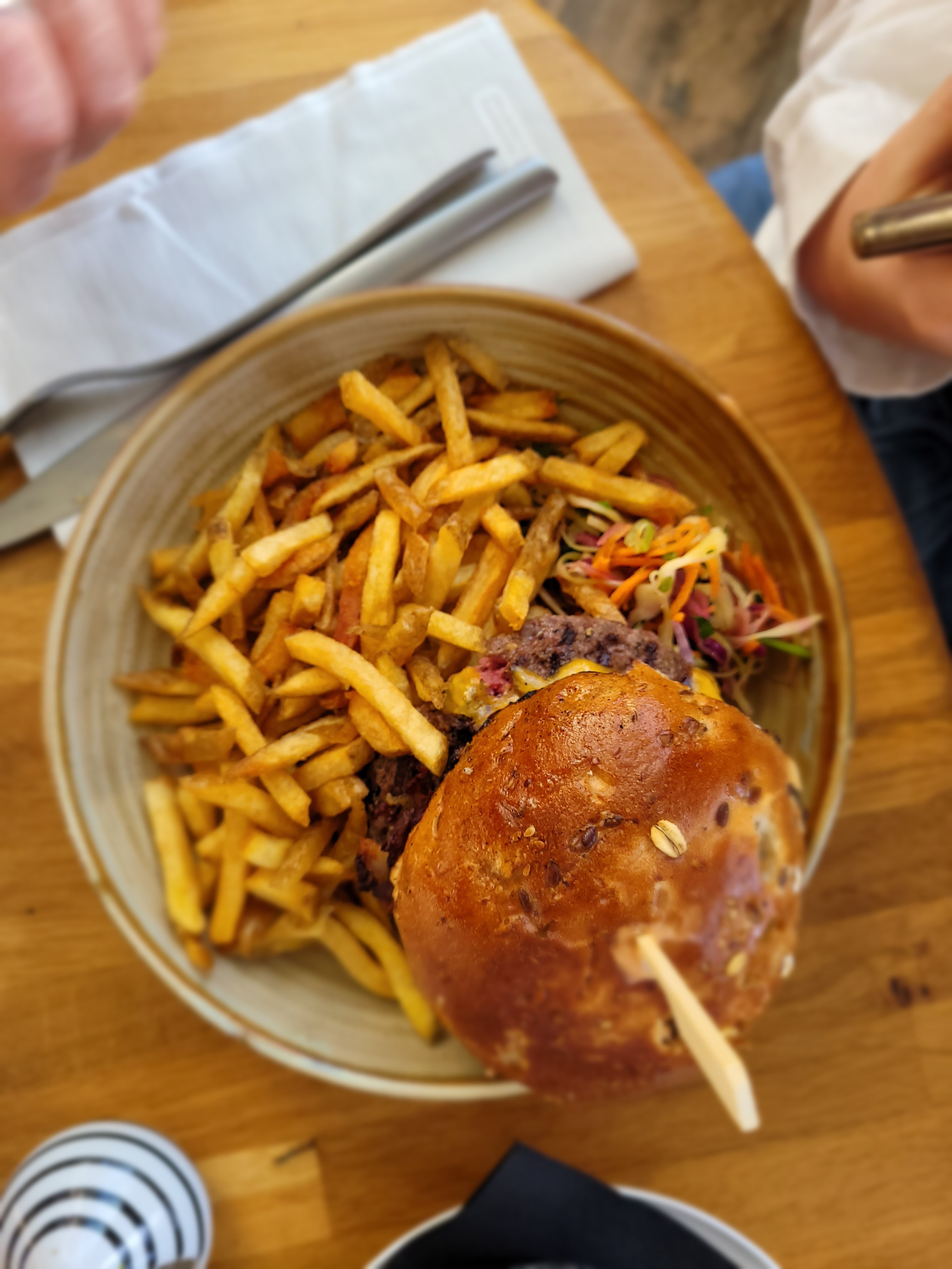 Restaurant chaleureux qui nous accueille malgré un retard considérable, qui propose de bons burgers accompagnés de frites et d'une salade malgré un prix qui me semble un poil trop élevé (le plat ci-contre a coûté 19€).