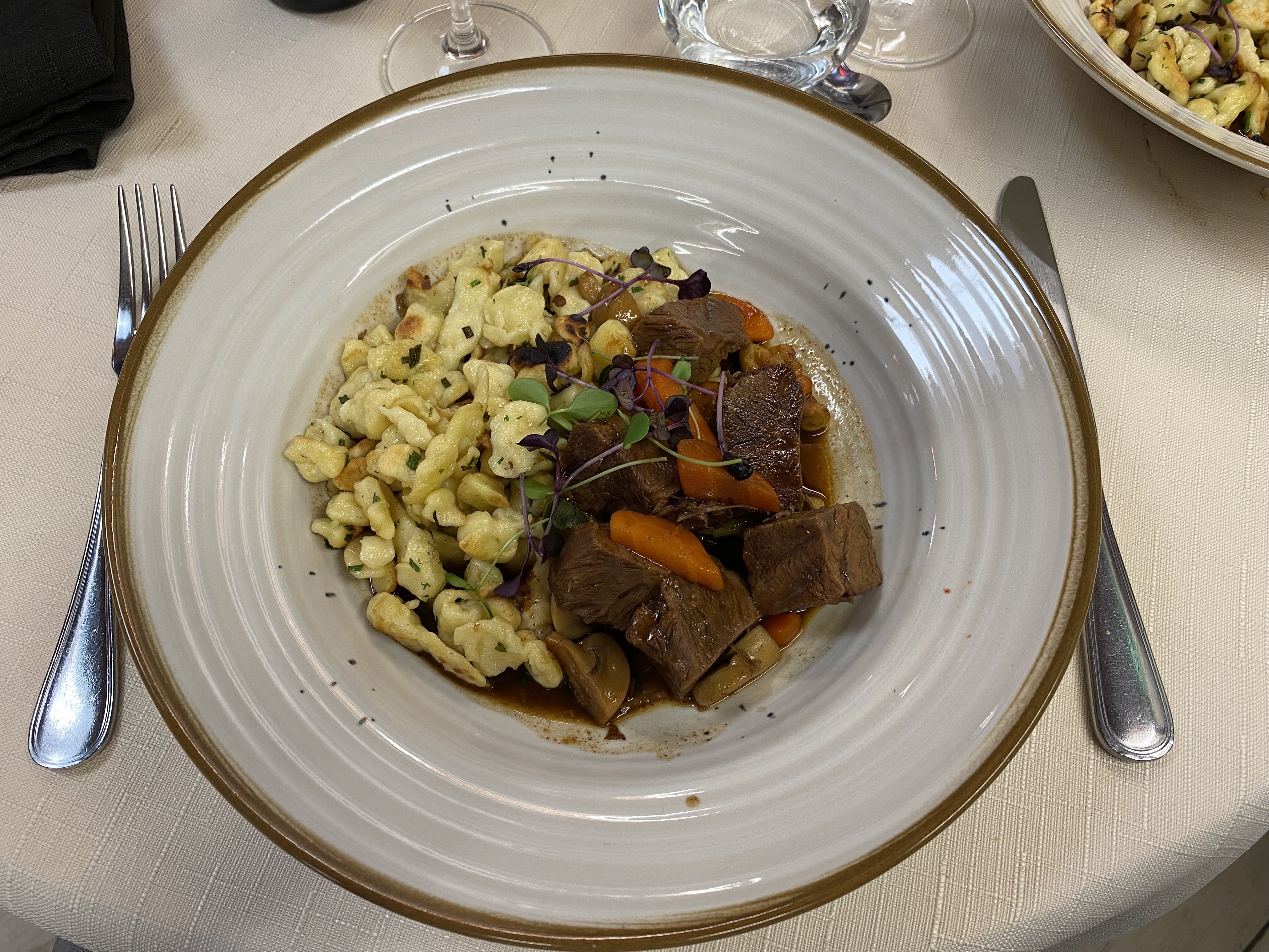 Un délicieux Osso bucco servi avec des pâtes fraiches italiennes, un délice. Un patron et une patronne toujours complices des convives grâce à une bonne dose d'humour