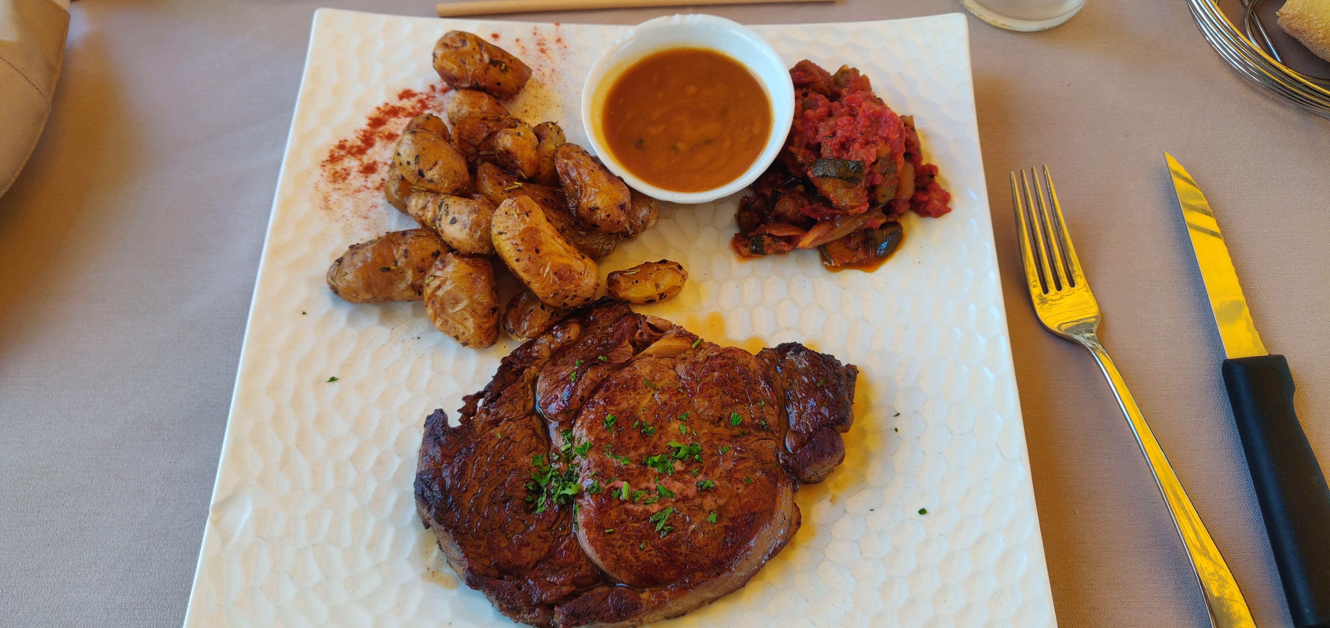 J'ai mangé avec 5 personnes, j'ai finalement dégusté une vraie entrecôte, la meilleure de France depuis des années. Les autres plats étaient également au-dessus des attentes. Le service était rapide, avec le masque transparent au bon endroit, et sympathique. Recommandé!