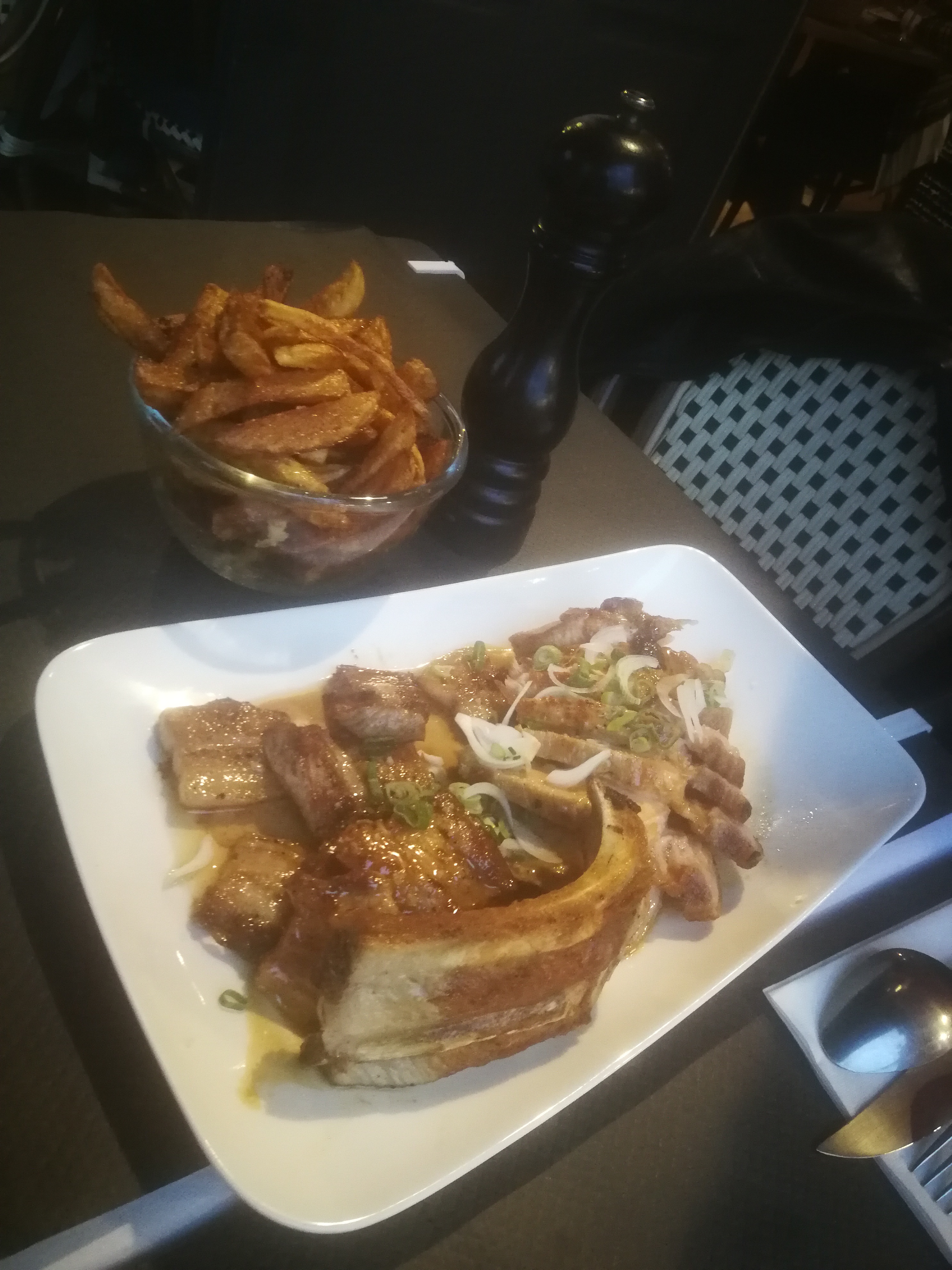 Super expérience. Je recommande ce restaurant. Le service était souriant et les plats très bons. Nous avons pris les cotes de porc grilles à partager. C'était top et les frites étaient également très bonnes Par contre la planche de charcuterie était très moyenne