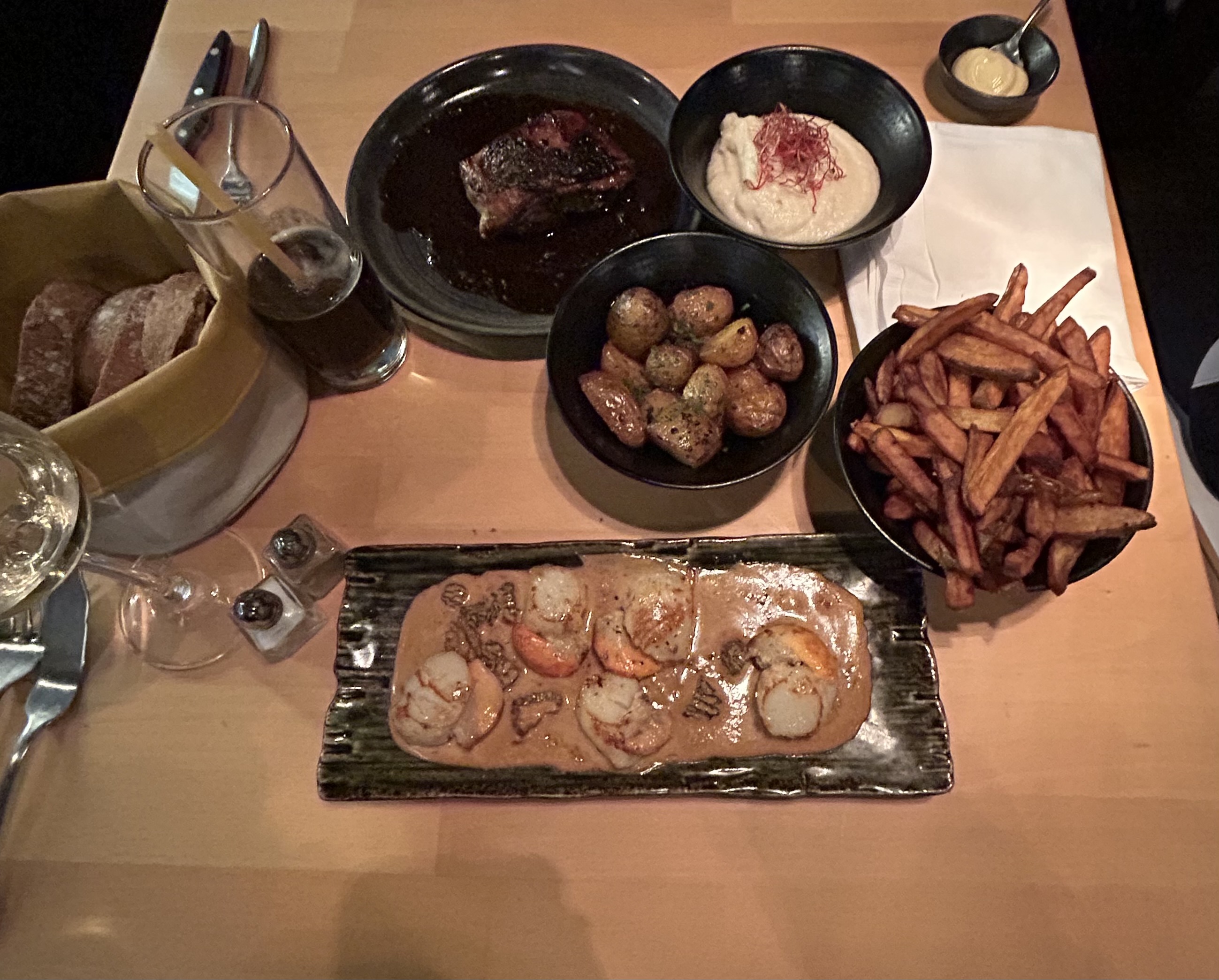 Nous sommes venus avec mon chéri pour dîner au 2ème service (en réservant) et l'accueil fut ok mais la place à côté de la porte d'entrée + collée au couple à côté de nous, bof. Puis nous avons attendu 1h pour une grosse pièce de viande à 2 saignante. Heureusement que nous ne nous ennuyons pas ensemble ! 😅