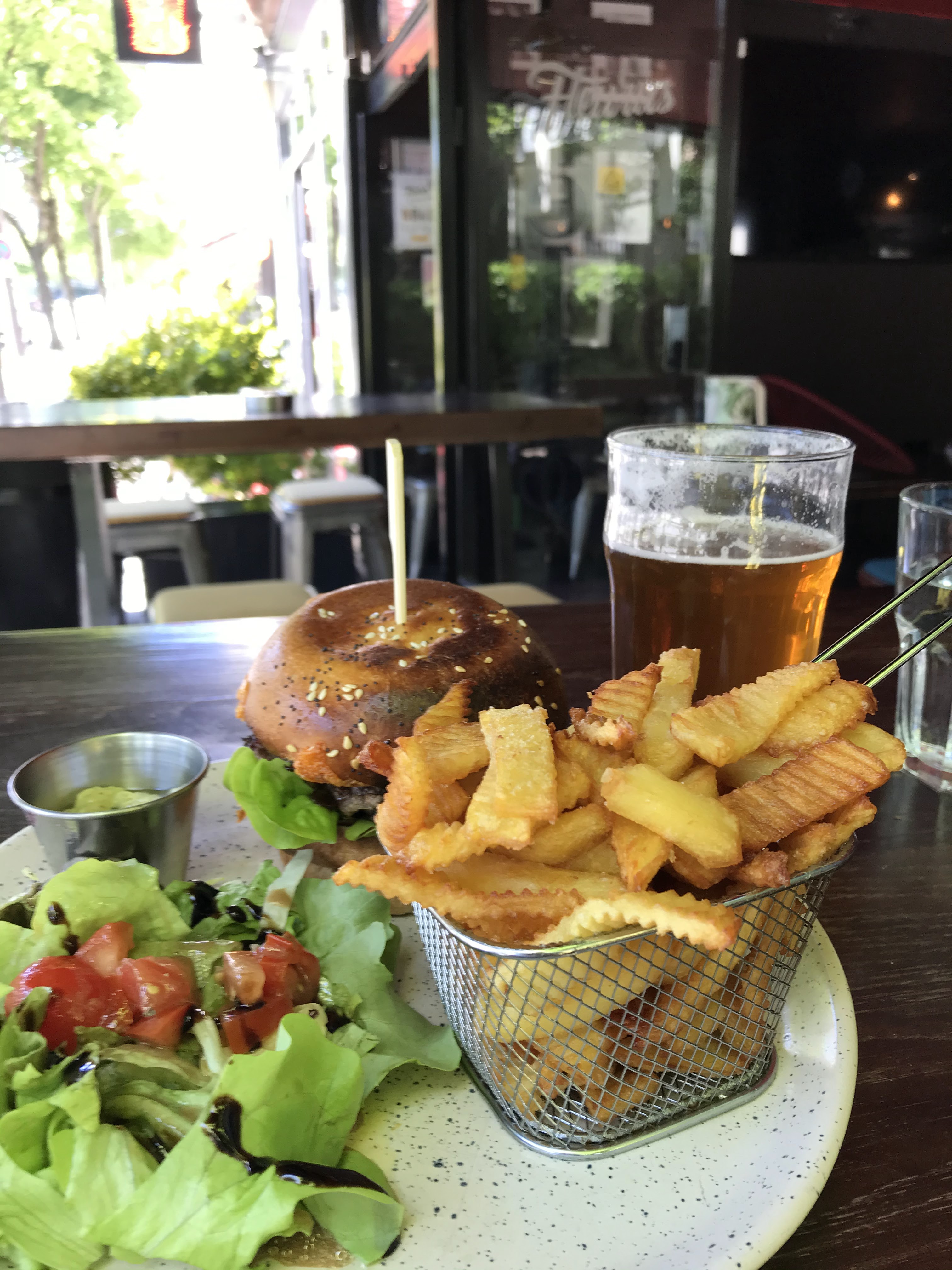 J'ai rendu visite à mon ami et nous nous sommes assis dehors par cette belle soirée d'été. J'ai commandé un burger végétarien pour 15,5 € et mon ami a pris un burger américain pour 15 € ! Le service était bon et rapide. La nourriture était assez bonne avec une belle présentation également. L'ambiance extérieure est correcte avec plusieurs autres clients, et le seul problème est d'être juste à côté de l'arrêt de bus. Sinon ça va, peut-être un peu trop cher. Je n'ai pas pris un verre cette fois, peut-être la prochaine fois !