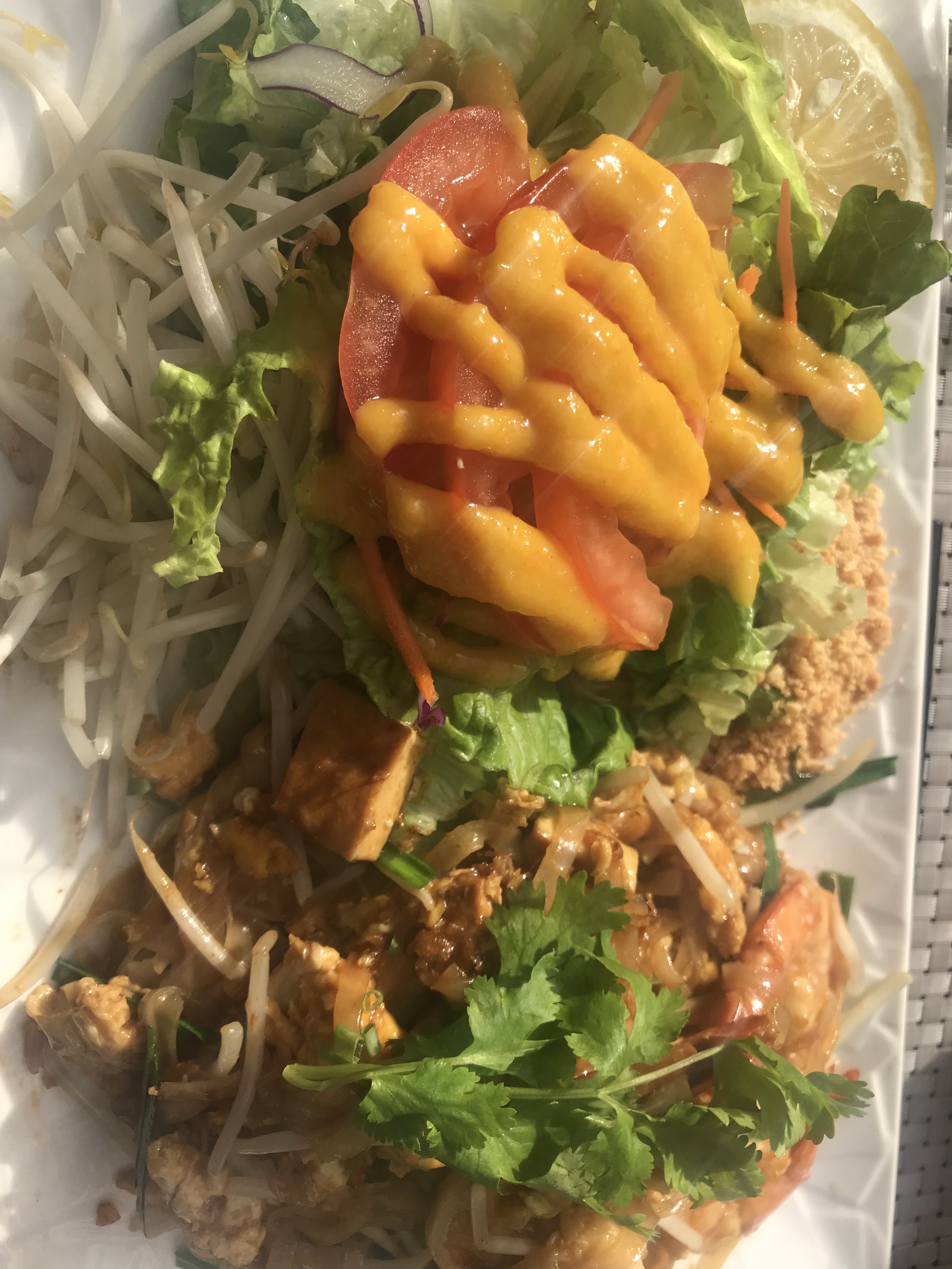 pad thai trop sucré ( snack tradi thai ) salade citronel calamar = 85% de laitue bon petit rouge bio jy retounerais pas