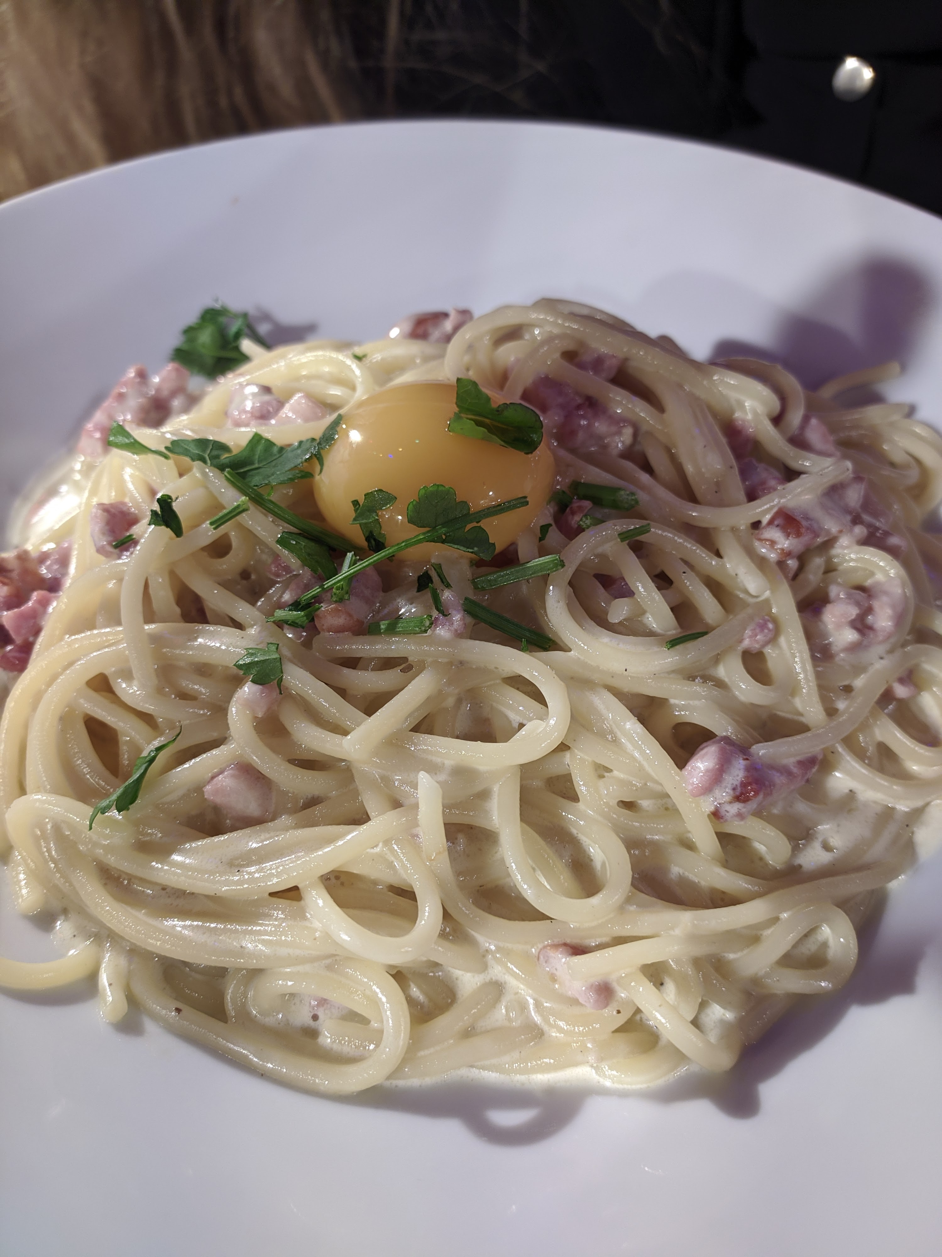 Le restaurant est pas mal mais nous avons pris des pâtes à la carbonara et vraiment déçu… Elles n’avaient pas de goûts, il faut revoir la recette car le prix n’est pas excessif (17€) mais pour des lardons industriels et une sauce qui n’est pas une sauce de carbonara nous avons été très déçu.