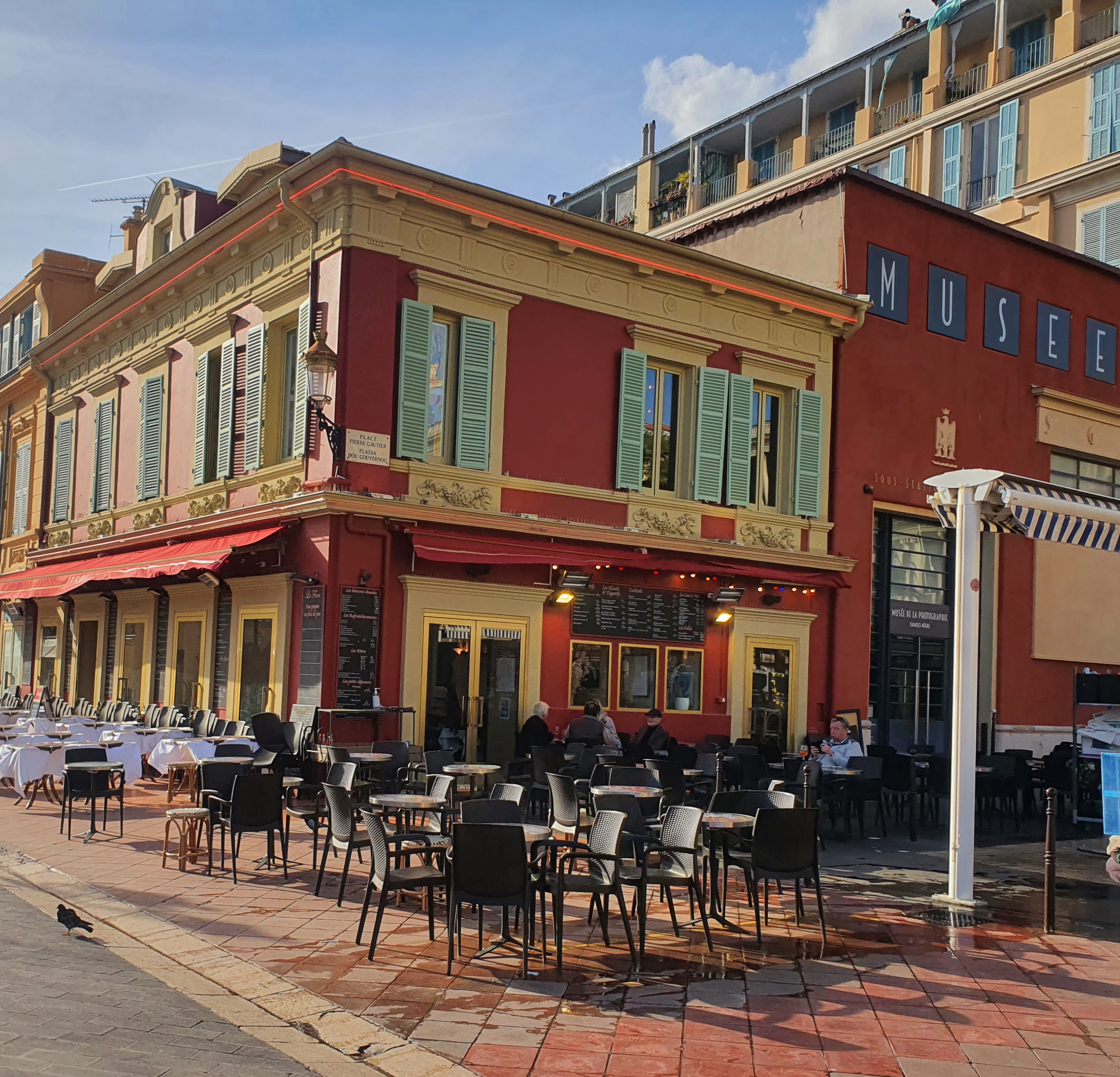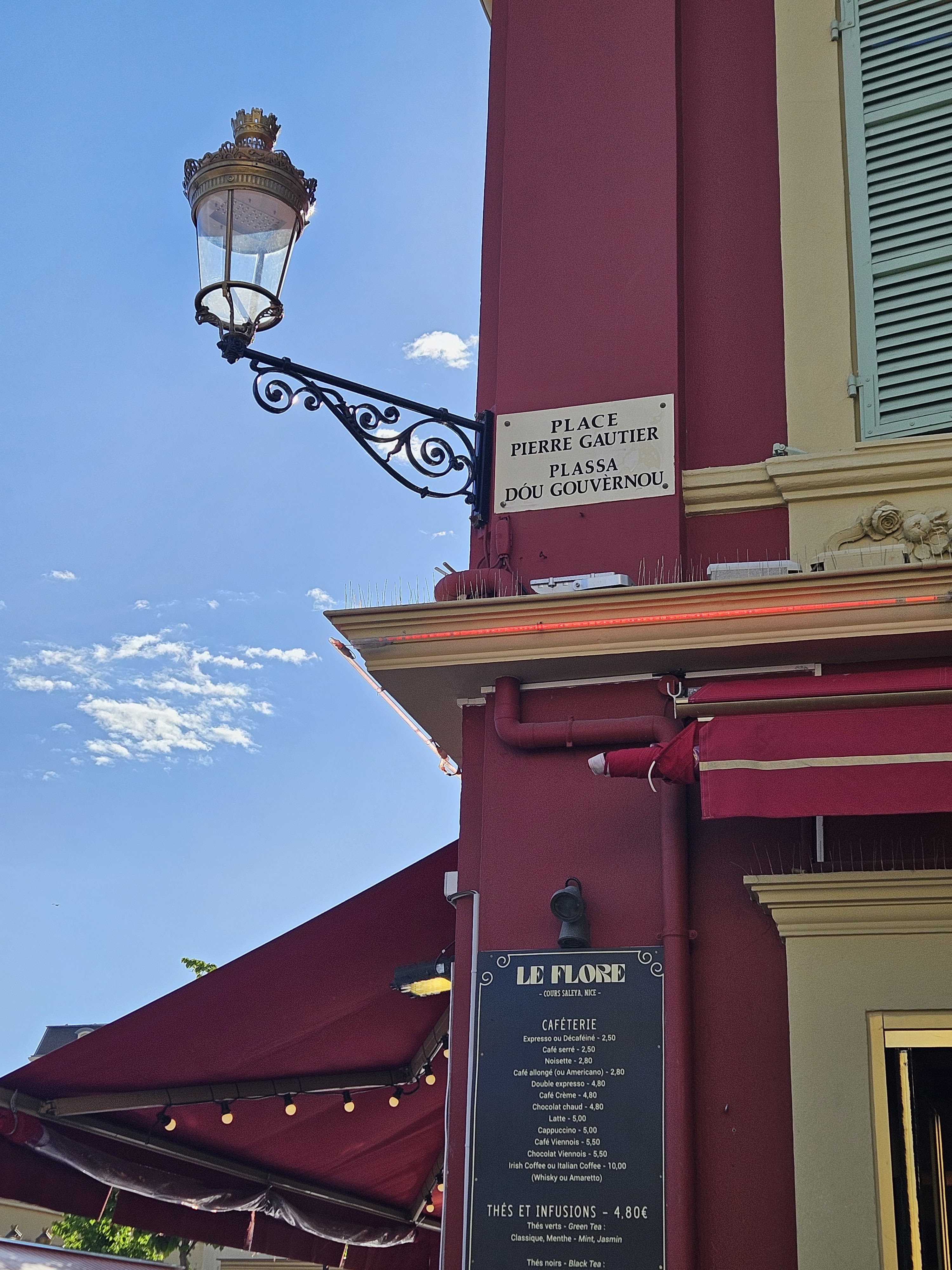 Brasserie- Bar. Belle terrasse à l'angle du cours Saleya et de la place Gautier. Idéal pour déjeuner tranquille au soleil tout en admirant le marché aux fleurs et les façades du cours Saleya. Plats simples, ne pas y venir pour une cuisine recherchée. Prix tout à fait corrects vu l'emplacement et des plats du jour à bon rapport qualité prix
