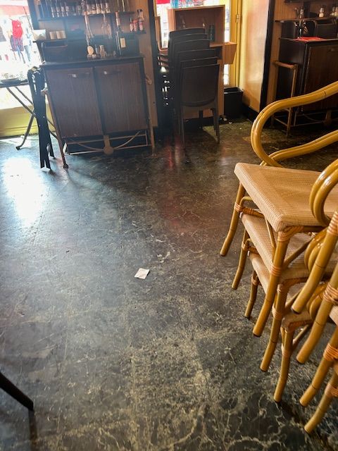quel endroit sale. Même notre table en photo ci-jointe n'a pas été nettoyée et nous avons été servi tel . Le reste doit reflété ce que l'on voit. Je n'ose pas penser à la cuisine.... La montée aux toilettes , la salle jusqu'au bar . Ma mère m'aurait dit , tellement c'est sale qu'une mère cochon n'y retrouverait pas ses petits....