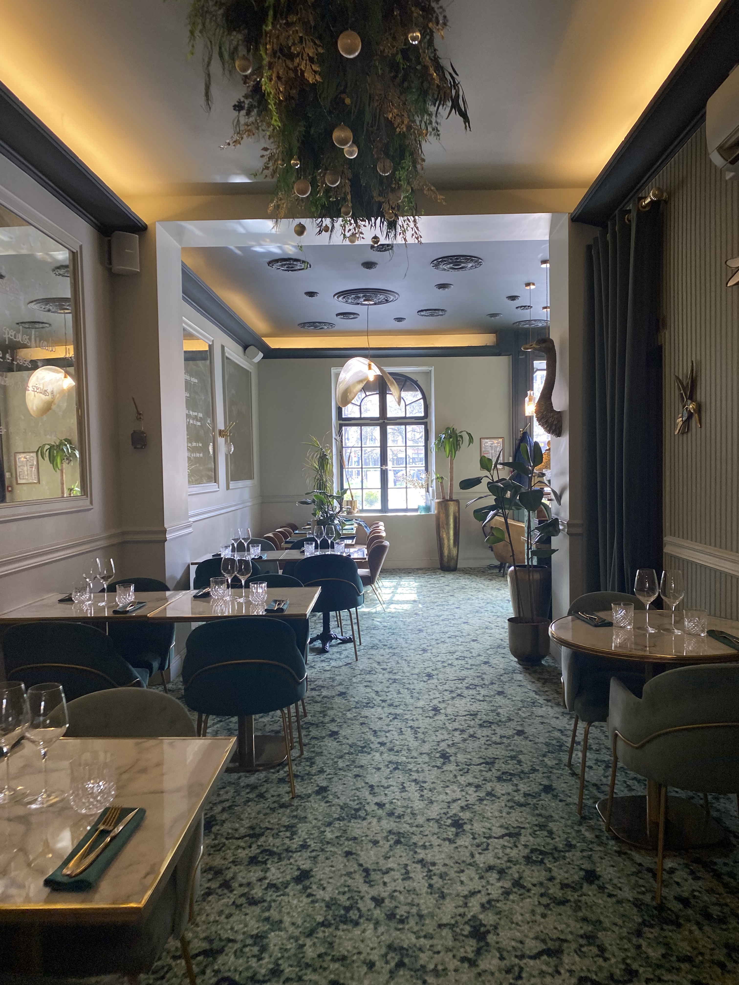 Ambiance très prometteuse d'un restaurant moderne et tendance. La décoration est très intéressante avec des plafonds vegetalisés et une cheminée décorative. Cependant, il faut y aller à midi car le soir, l'éclairage est tellement faible que j'ai eu du mal à lire la carte et voir les plats. Les plats sont bons mais trop compliqués et guindés pour moi comme la carte et le service. La prestation d'ensemble est intéressante mais le style restaurant chic Parisien ne me plaît guère. Les prix pratiqués sont élevés ( 50€ par personne) et j'ai vu écrit que le restaurant ne prend pas les titres restaurants.