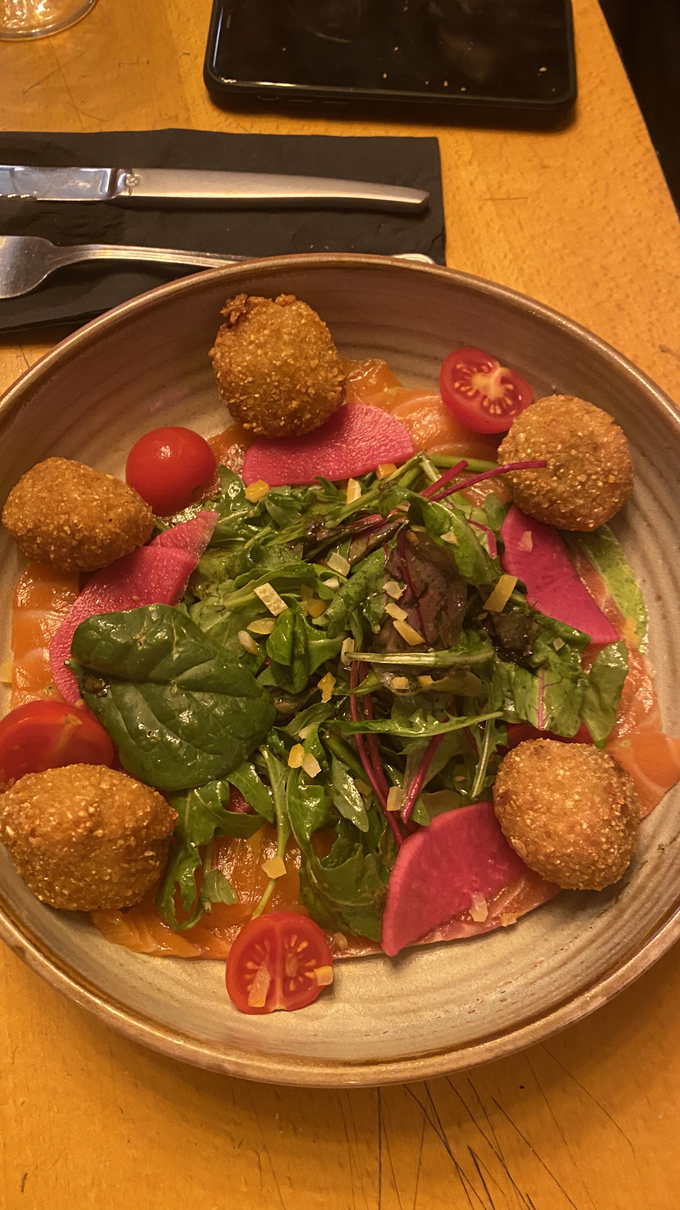 Accueil au top dans un joli cadre, large choix de boissons, belle carte de plats et prix raisonnables, personnel chaleureux et aux petits soins, musique présente mais pas assourdissante, nous avons passé une très belle soirée