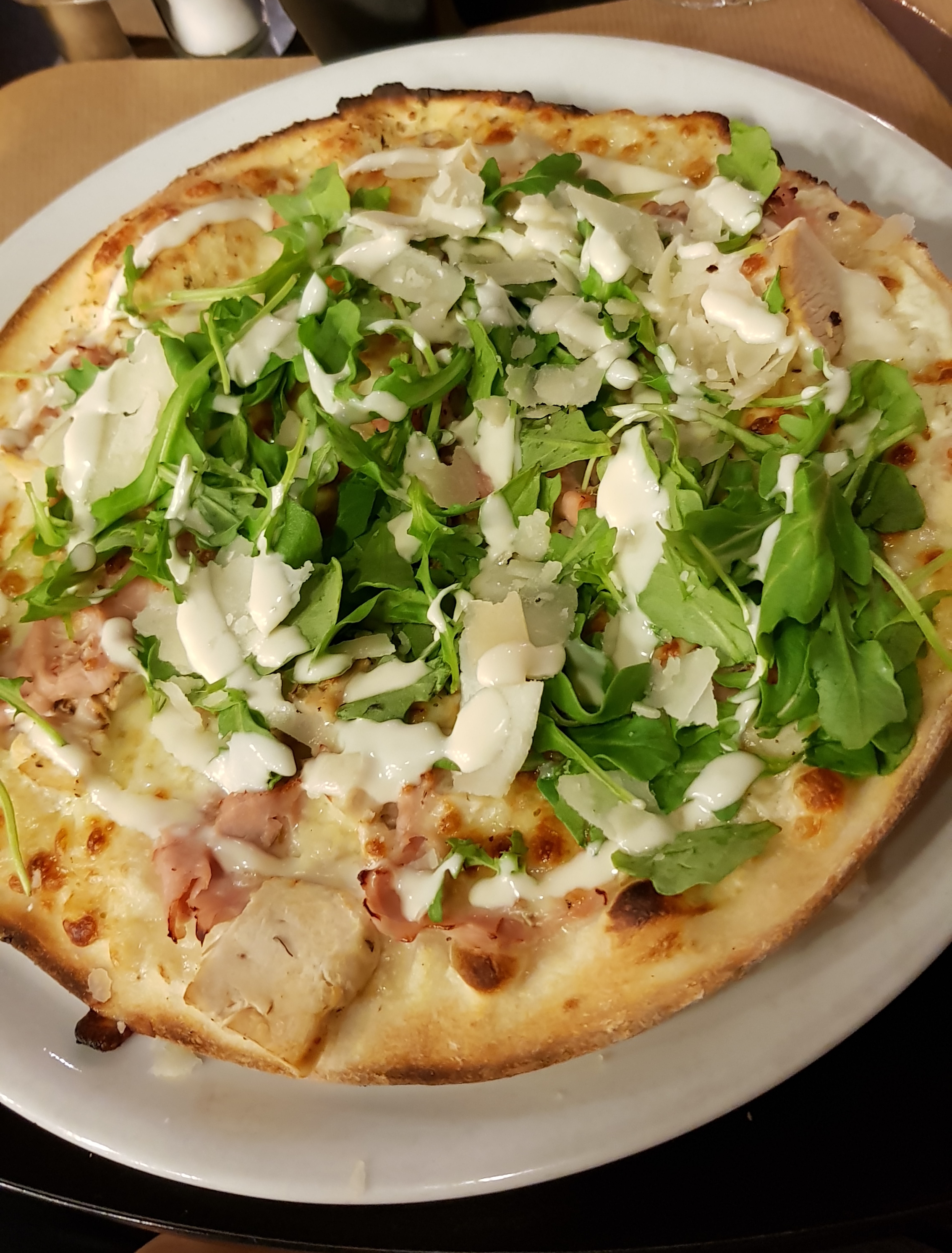 Je n'avais jamais mangé une pizza si fade, je n'ai pas pu finir (pizza saumon), j'ai trouvé la pâte vraiment pas bonne et pas cuite. Le dessert était très bon en revanche et les plats avaient l'air pas mal.