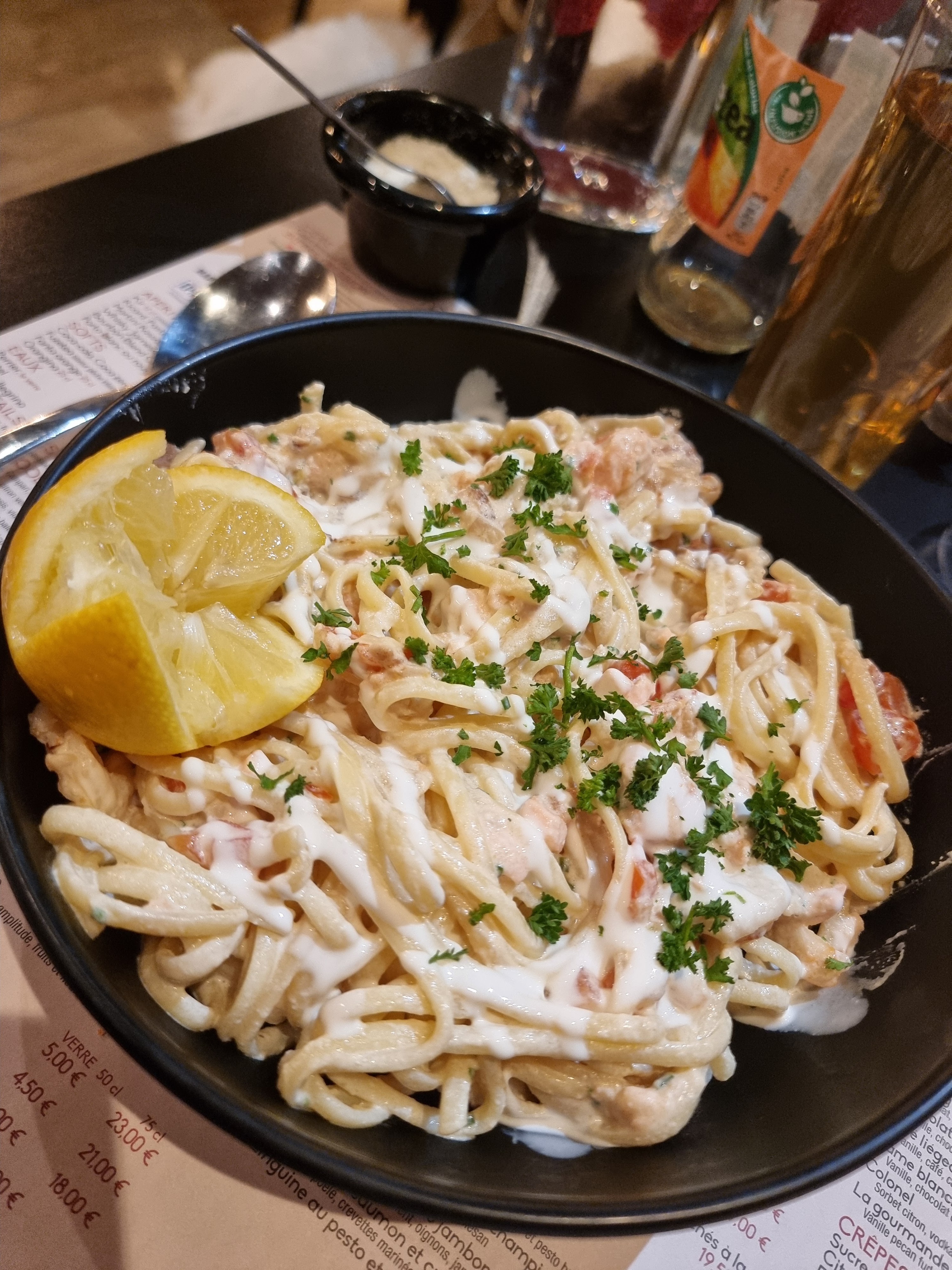 Restaurant très sympathique, dans un joli cadre. Repas copieux, je vous conseille les linguines au saumon poireaux à la crème 😉un régal ! Mais vous avez vraiment beaucoup d'autres choix ! Le personnel est très agréable et à votre écoute. Allez-y, vous ne serez pas déçus👍😉