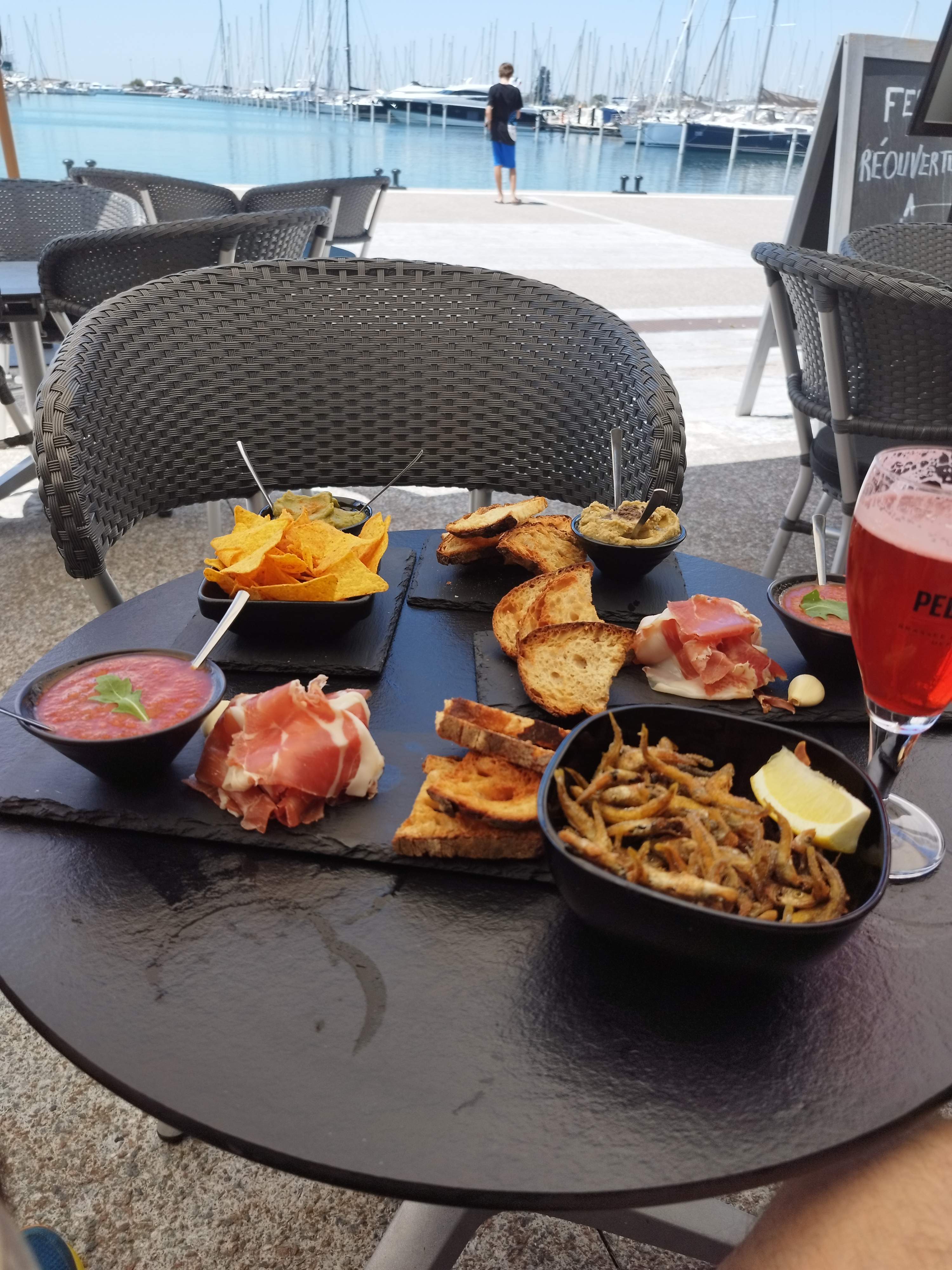 Venu en fin de matinée pour un petit déjeuner et en plus un grand café. La baguettine était délicieuse, les mini viennoiseries aussi, et le café très bon. Vue splendide sur le port. Et un serveur au petit soin, qui s’excuse à plusieurs reprise étant seul. On est pas pressé et encore merci pour sa gentillesse. Je vous conseille pour y faire votre petit déjeuner. Repas du soir Tapas et apéritif au top.