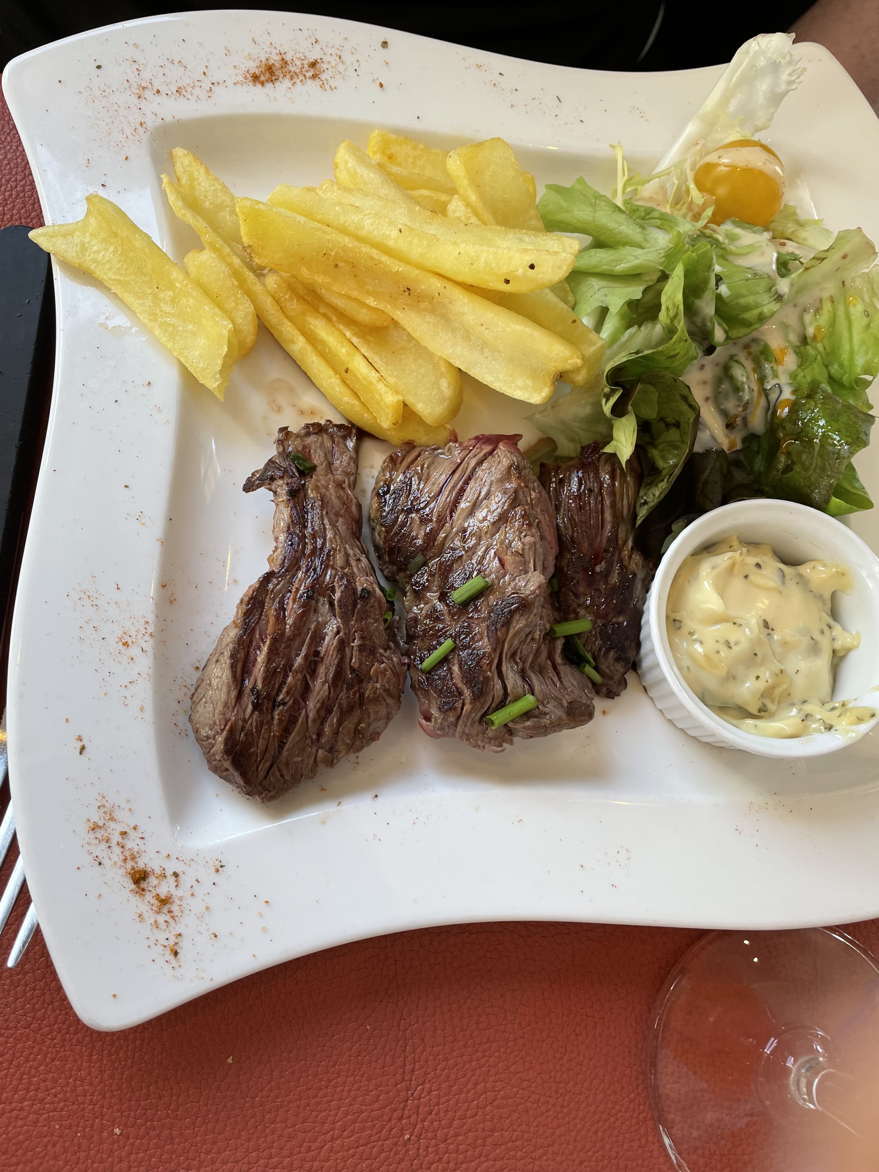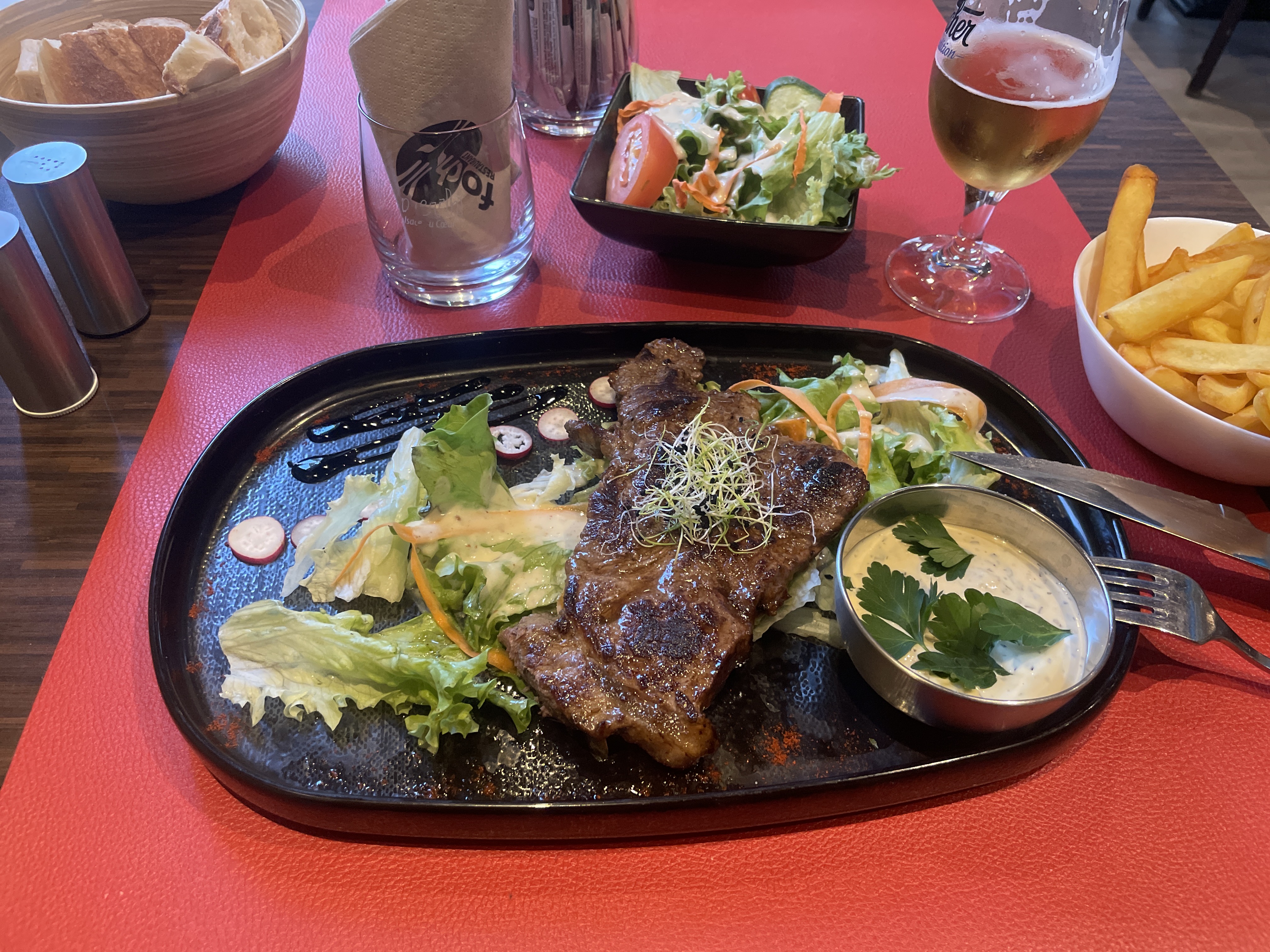 Un service très sympathique , les repas correct. L'onglet est très bon. Il est dommage d'avoir eu les légumes froid dans l'assiette.