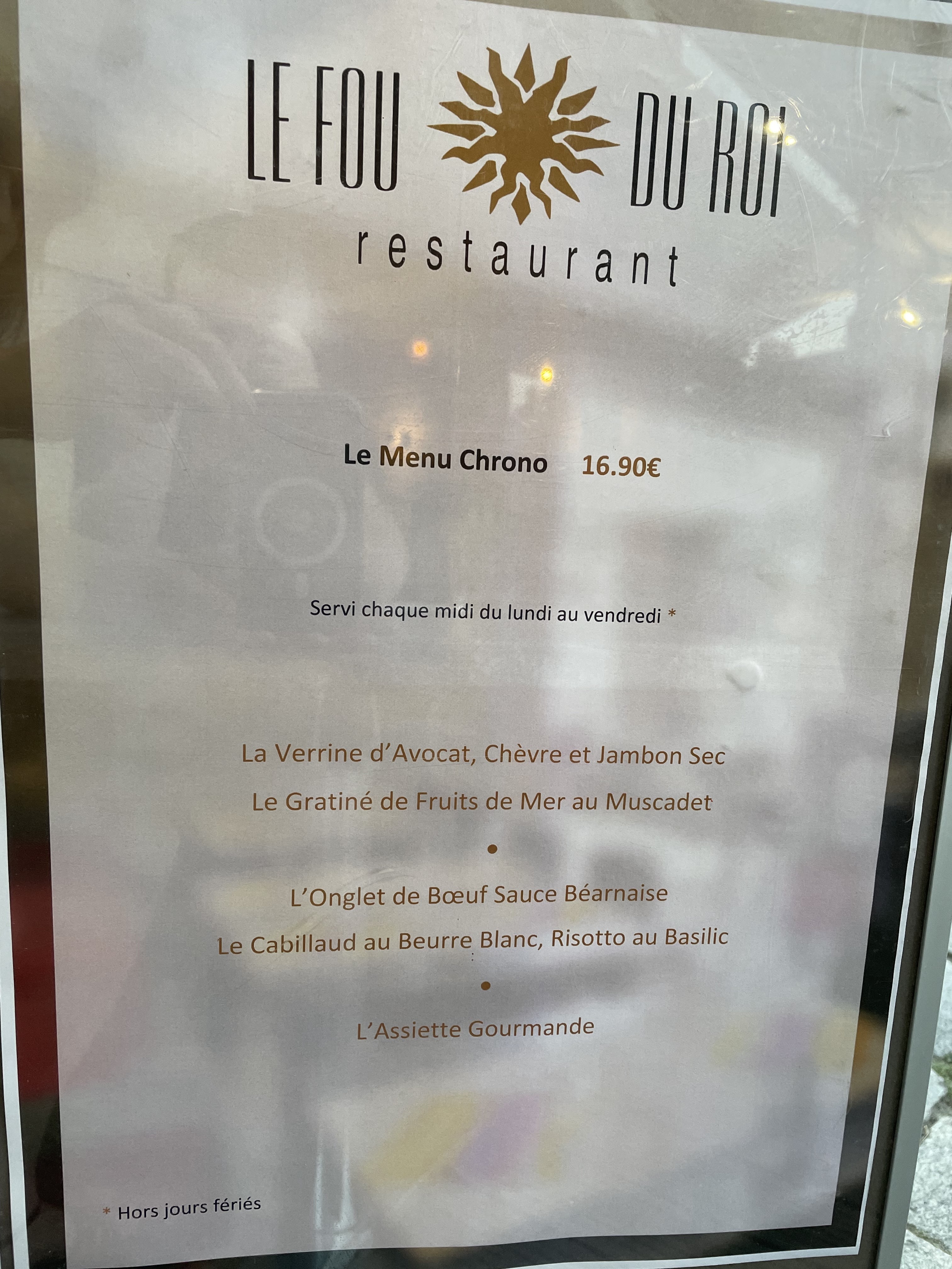 Quel plaisir ! Un menu du jour complet inspiré et délicat, pour une somme correcte. Addition bien inférieure et tellement meilleure à tout ce qu'on peut trouver dans une chaîne de grande enseigne, la cuisine du Fou du Roi démontre avec brio qu'on peut ravir ses clients avec une enveloppe maîtrisée. Ayant mangé en terrasse je réserve la 5eme etoile à une prochaine visite à l'interieur :-)