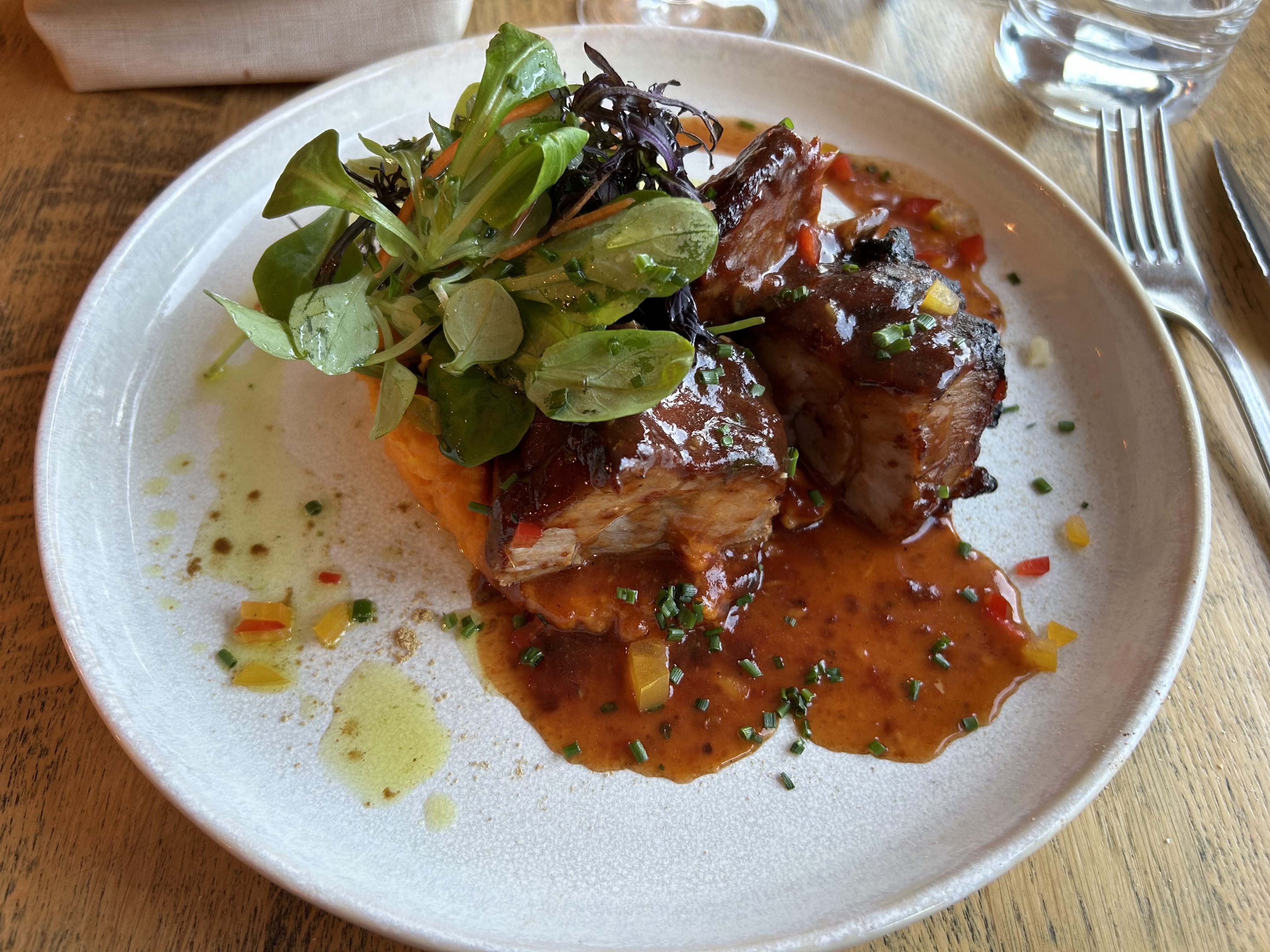 Cadre magnifique à proximité du château. Plat commandé : selle de cochon. Viande très bien préparée et fondante. Je recommande également l'assiette de fromage