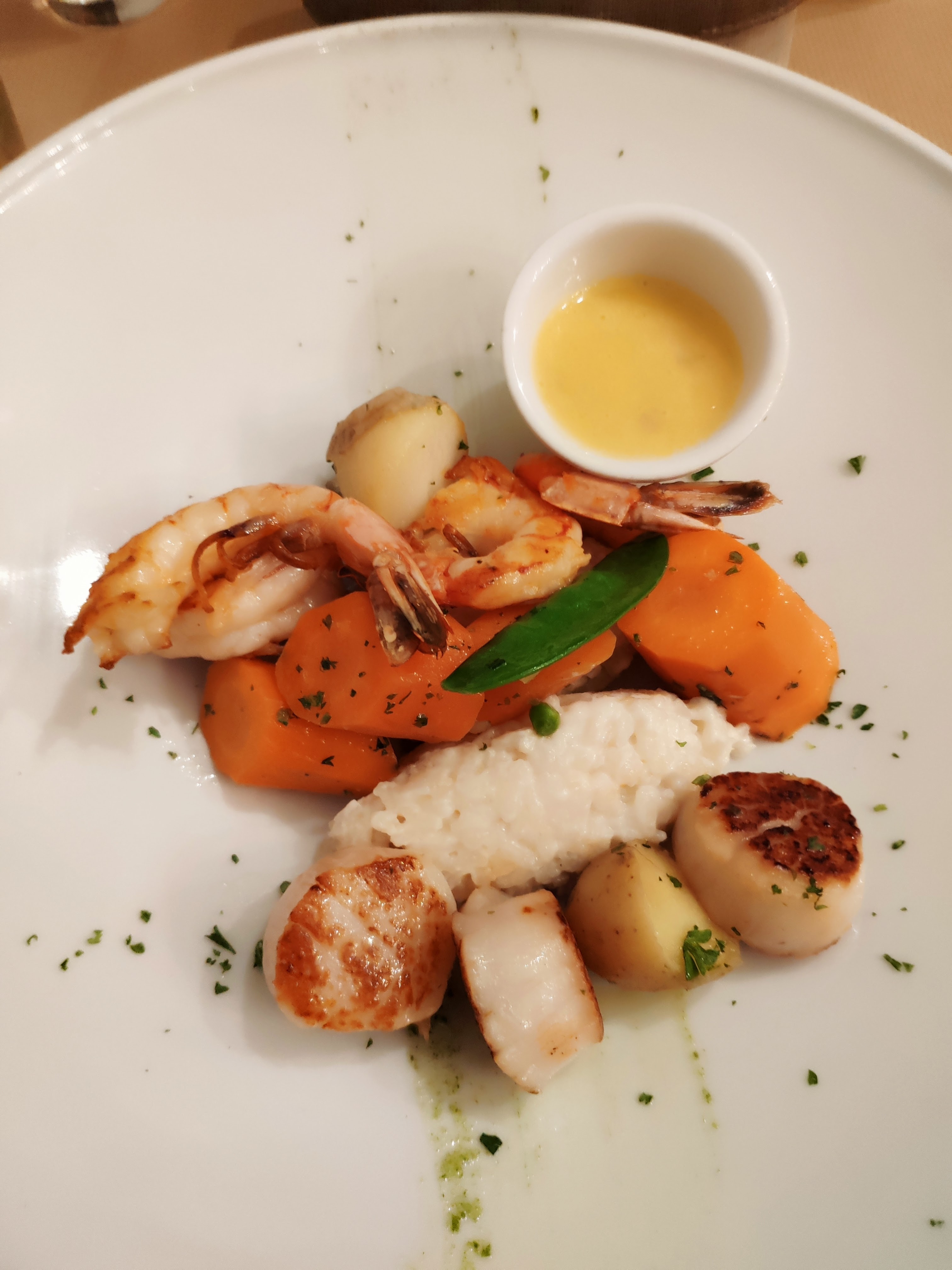 Rien de folichon L'entrée mousse d'avocat légère mais dommage le piment d'Espelette masquait complètement l'avocat et le jambon cru séché n'était pas une bonne idée La cassolette de fruits de mer basique, pas sûre qu'elle soit maison La tendreté de la viande toute relative L'accompagnement du poisson semblait être du congelé (les petits pois en décembre ?) Quant au dessert servi sur une serviette en papier inutile, les financiers étaient de fraîcheur inégale, la mousse au praliné probablement un entremet en sachet Et pour finir la carte des vins assez chère Je n'y retournerai pas
