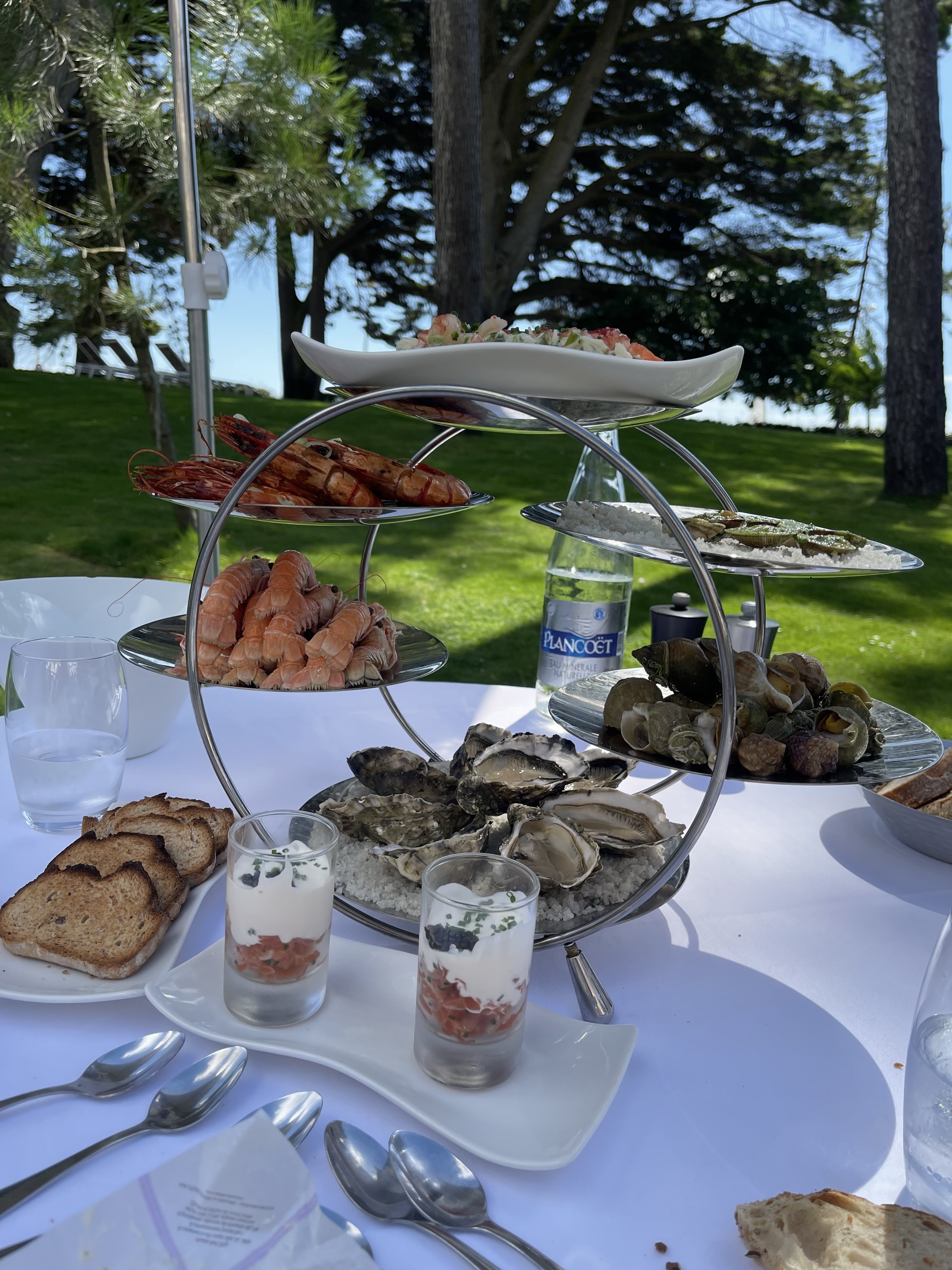 Nous venons tous les ans au Royal pour son buffet plein air ou à l Intérieur en fonction de la météo. Cette année le buffet s est beaucoup rétréci, moins de fruits de mer,moins de plats chauds et pas de fruits frais. Le champagne nous a été servi dans des verres à vin, car ils n avaient pas,assez de coupes. La cafetière NePresso qui sert eau chaude et 2 cafés en même temps,en panne sur 1 café, puis une capsule coincée :conclusion une longue file d attente .et ils n avaient pas de cafetière de remplacement. A plus de 80 euros par personne, on s attend à mieux.et la cerise sur le gâteau, nous étions avec 3 enfants qui ne boivent donc pas d alcool, l eau en bouteille est payante et même le jus,d orange. Dommage car l endroit est fort agréable.