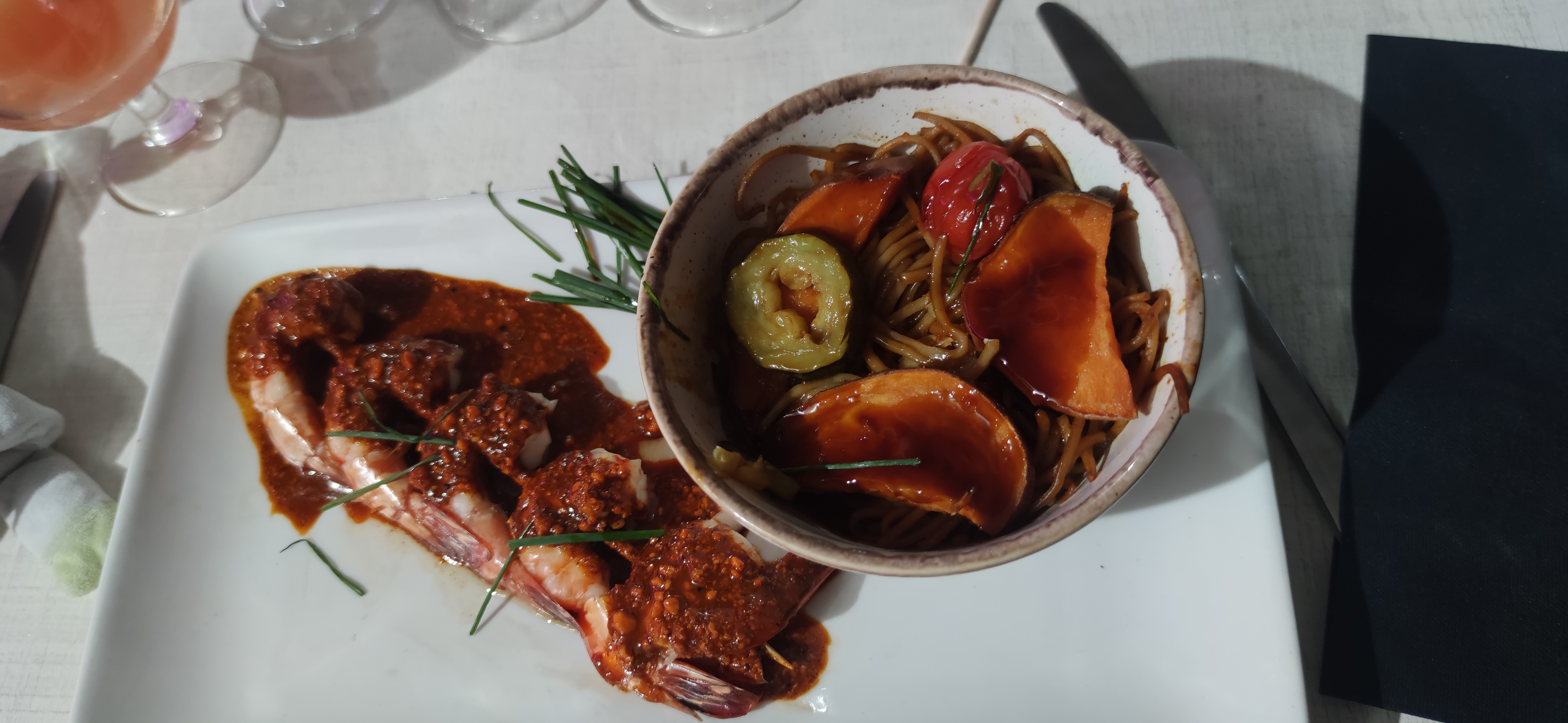 Accueil pressé, trois différentes personnes viennent nous demander nos choix à peine assis alors qu'il n'y a personne dans le restaurant. Nous commandons un pichet de Merlot vraiment pas top, des gambas avec pad thaï et thon avec pad thaï. Les plats sont arrivés en 5 min, cela devait être déjà prêt. Le thon était bon, par contre le pad thaï était en fait des spaghettis avec de la sauce, rien de thaï. Gambas servies avec la tête en plus pour la déco, sympas pour meubler l'assiette vide. Ils ne nous ont même pas amené de sel et de poivre ni les gâteaux apéritifs qui étaient posés sur les autres tables. Groupe de musique dépassé qui joue de la soupe et ne nous laisse pas converser. La deuxième étoile est juste par ce que le restaurant est sur la plage. Arrêtez de prendre les gens pour des cons, nous avons un palais pas seulement un portefeuille.
