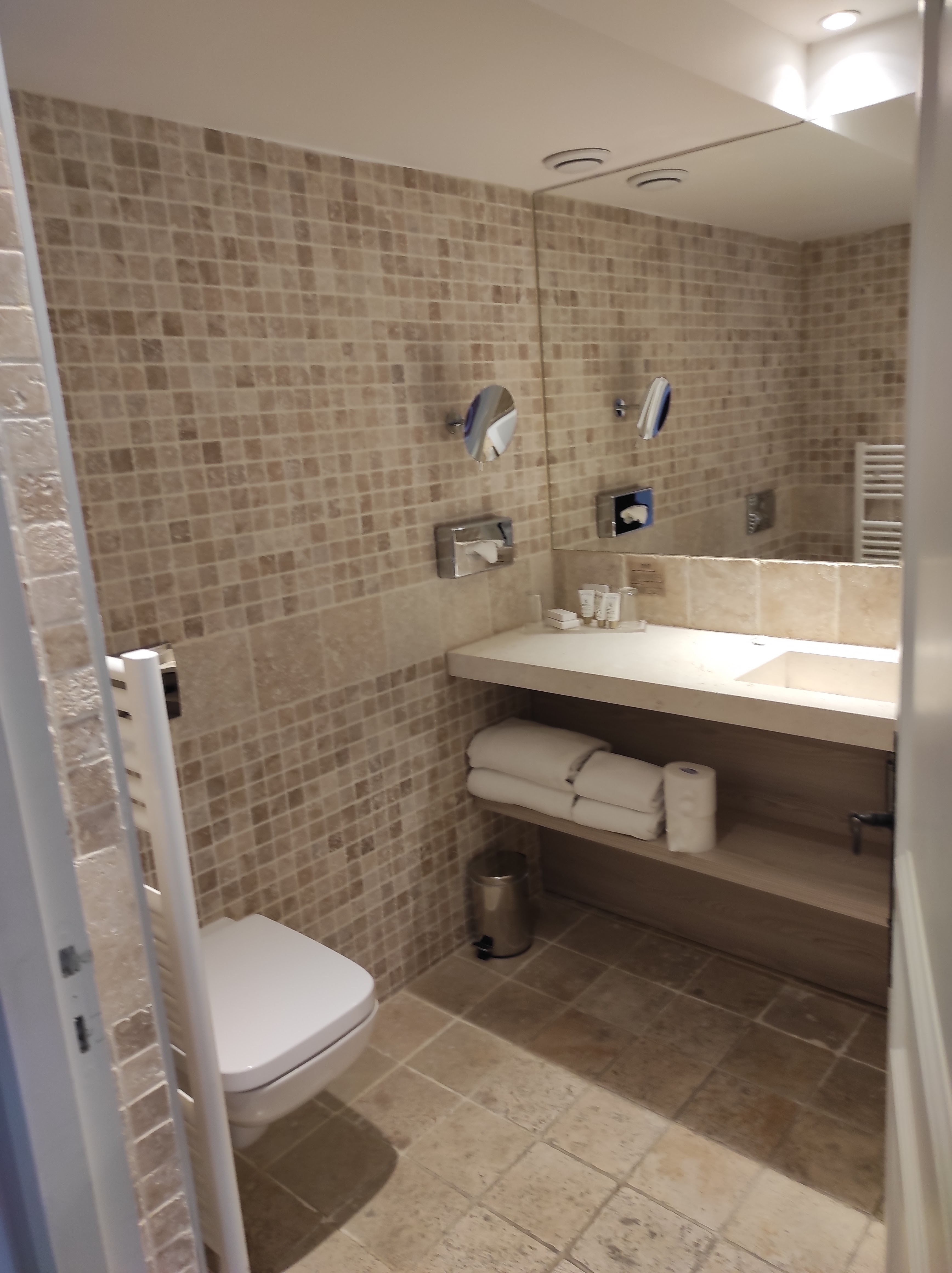 Le lieu est splendide, l'hôtel est très grand. Les chambres quant à elles sont bonnes mais pas de coup de cœur comme on peut s'apprêter à l'avoir en regard du cadre. Pour les côtés positifs, nous avons une chambre très spacieuse, plutôt propre, avec une terrasse privée et un lit confortable. Pour le négatif, une baignoire dès l'entrée, sans rideau ni paroi, qui vous condamne à mettre de l'eau par terre juste devant le lavabo... La douche est petite et les parois sont instables mais unique solution pour ne pas tout tremper autour de soi. Les bouteilles d'eau offertes ne sont pas systématiquement remplacées alors qu'on paie la nuit et la taxe de séjour, c'est quand même pas normal... La piscine extérieure est très jolie mais ferme à 19h, très tôt quand il fait encore jour en été... La salle de gym, pareil, elle n'ouvre qu'à partir de 8h et ferme assez tôt le soir... Bon dans l'ensemble mais certains éléments sont à revoir.