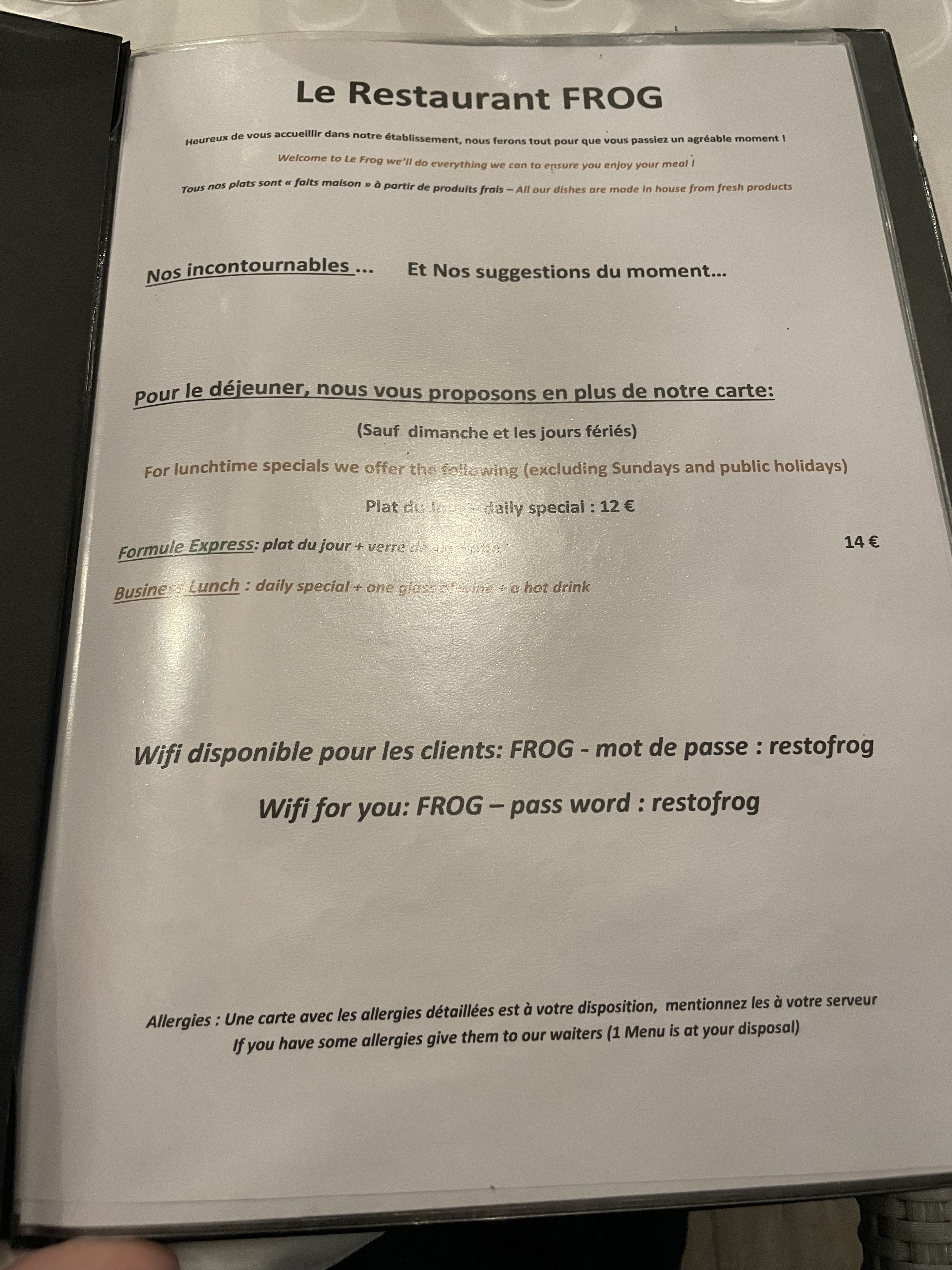 J'adore ce restaurant ! Excellents plats souris d'agneau dans son jus au thym et purée maison et salade pour 20euros. Un grand choix de plats poissons et viandes. Ainsi que biensûr des escargots et cuisses de grenouilles d'où son nom biensûr. Un.trs large choix de vin et du Bio également. Serveurs professionnels et très sympathique . Je vous le recommande vivement
