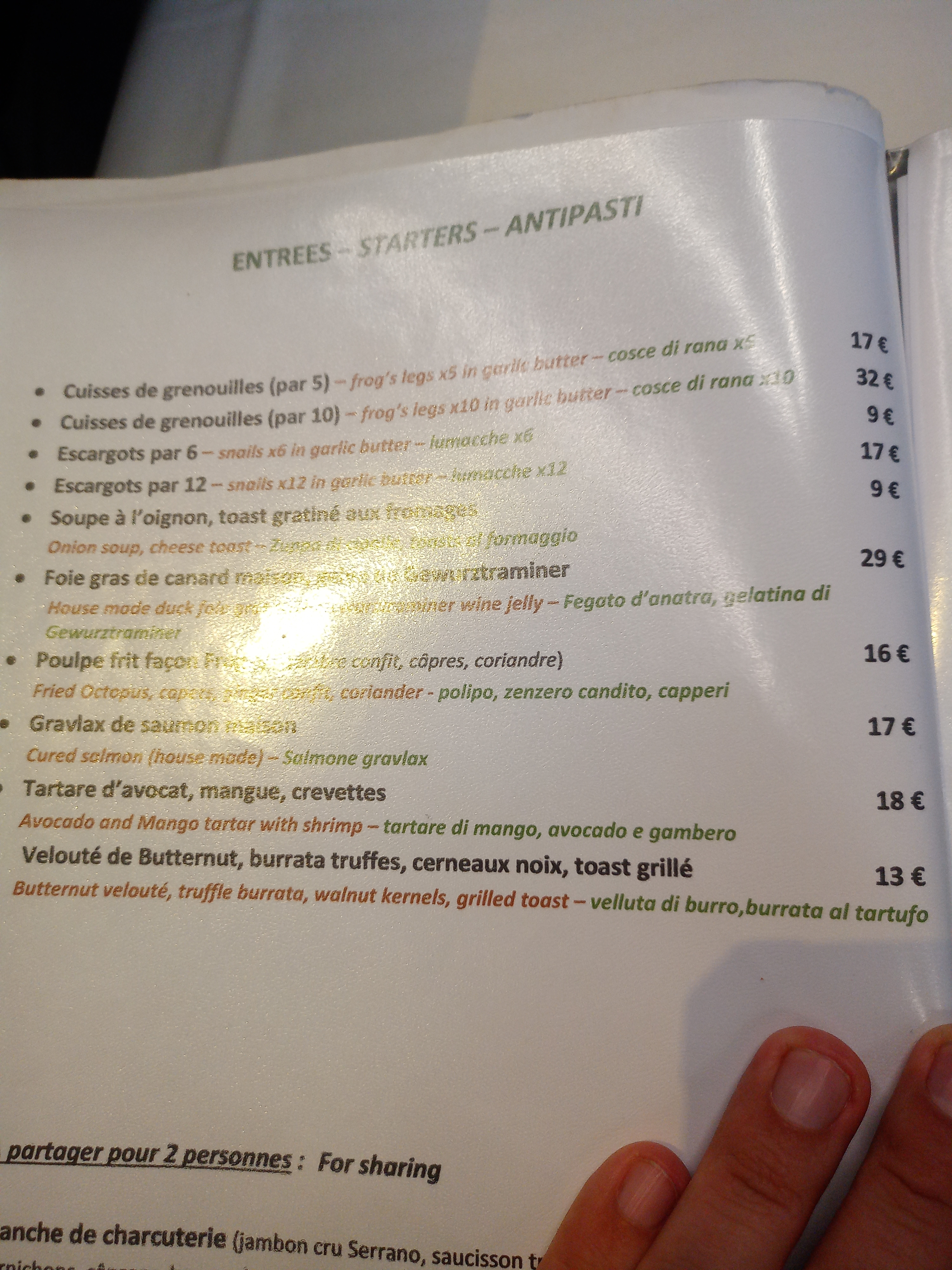La nourriture délicieuse, avec les prix raisonnables (30€/ personne). On a commandé des escargots, des grenouilles et le confit de canard. Le serveur était convivial et la localisation de restaurant était parfaite.