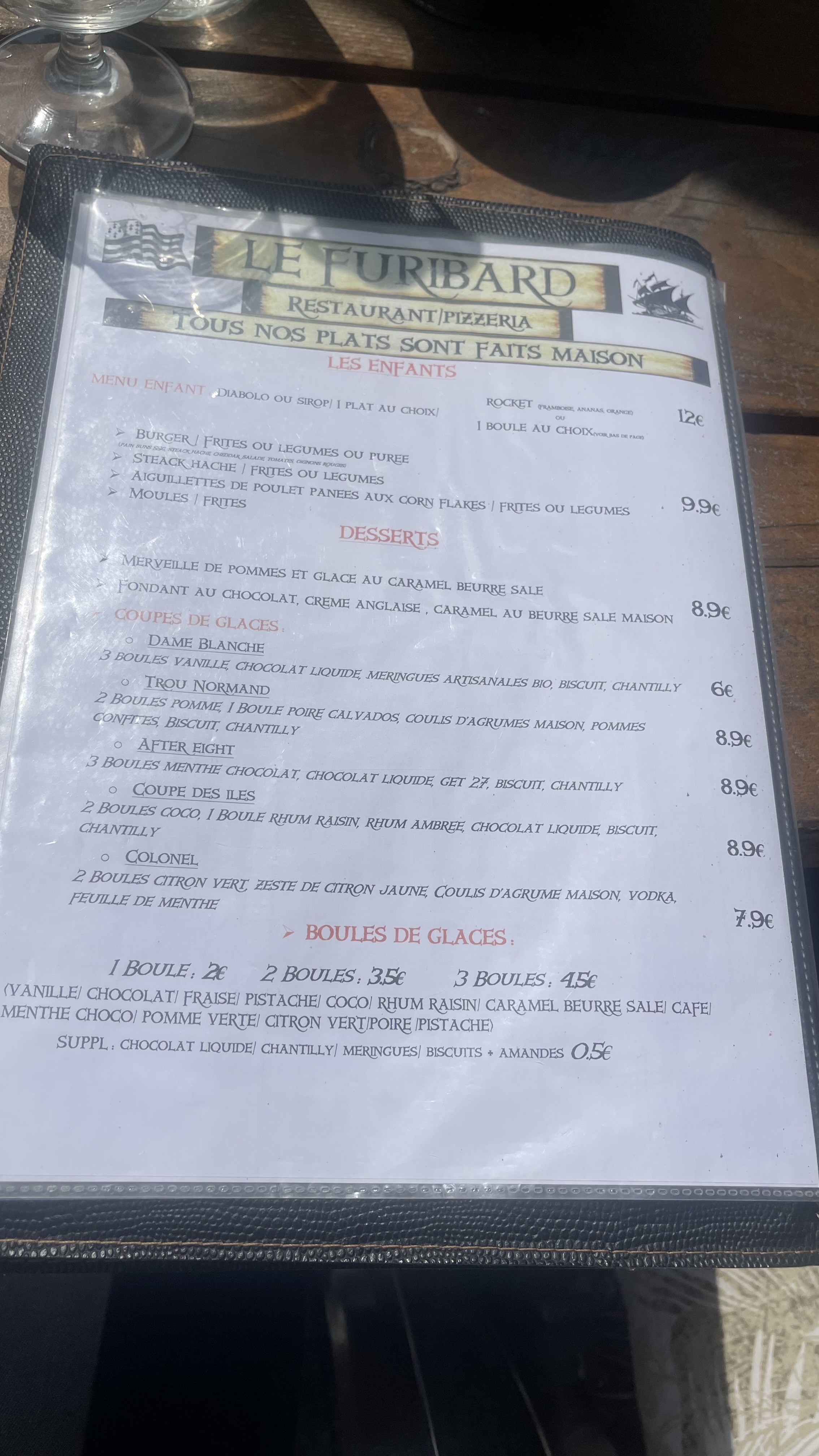 En entrant au Furibard, on s’est trouvé face au camping. Un peu inquiets nous nous sommes installés. Nous avons pris salade pour les uns, assiette de gambas pour d’autres. Concernant la salade : une bonne quantité et de salade et de crudités. La sauce est légère et ne prend pas toute la place. Concernant les gambas : 5 belles gambas partagent l’assiette avec une salade garnie et des frites croustillantes et finement salées. Elles sont cuites à point. Service en 20 minutes, notre serveuse est très gentille et pas intrusive pendant le repas. Privilégier d’aller à midi car à 13h il y a un peu plus d’attente. Les desserts glacés (trou normand et coupe des îles) sont qualitatifs et font beaucoup de bien sur une terrasse ensoleillée. En revanche il serait peut être intéressant de mettre moins d’alcool, ça surprend. Très bon rapport qualité / prix pour 4. Photos de la carte actualisée à suivre.