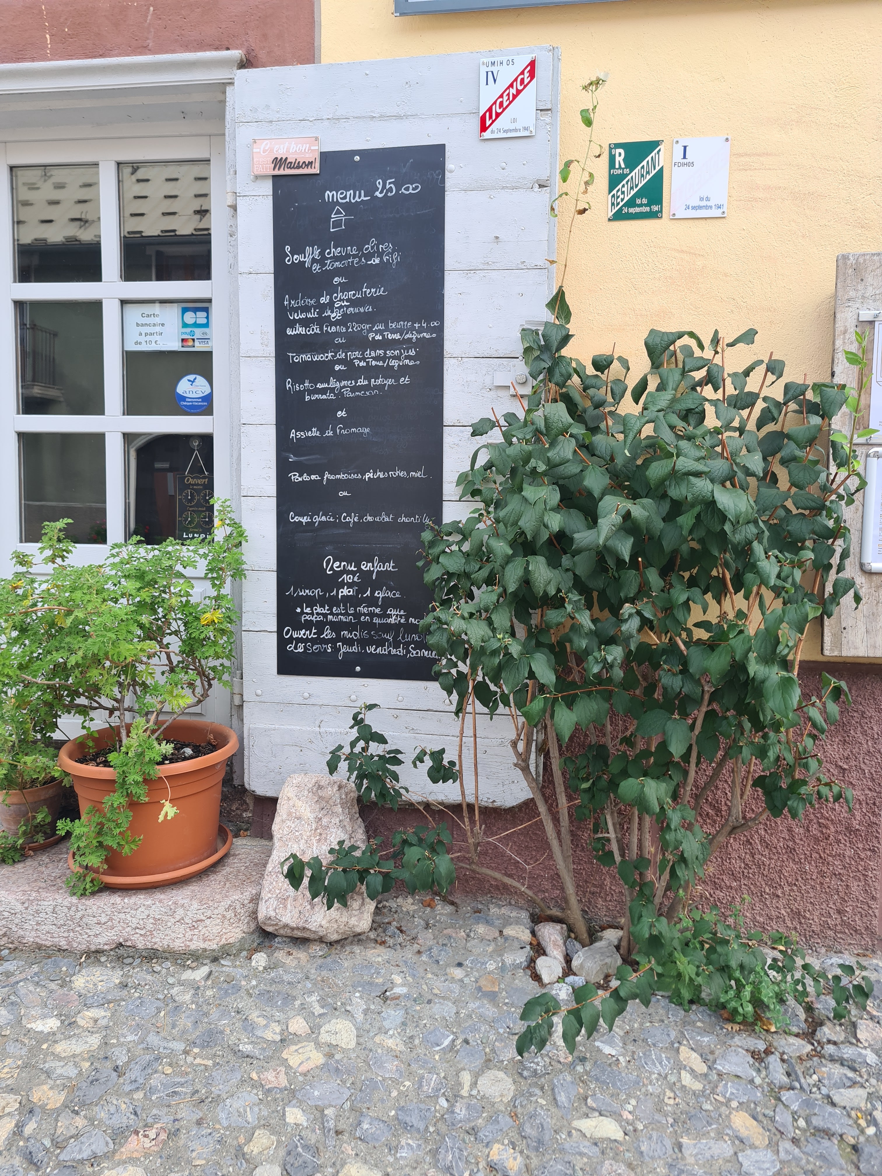 Super cadre (jardin), nourriture délicieuse avec produits du potager, prix très raisonnable et surtout super accueil de la part de Jacquie et Fifi. Je recommande de visiter Mont-Dauphin et de s'arrêter dans ce restaurant ! C'était parfait pour terminer nos vacances au Queyras.