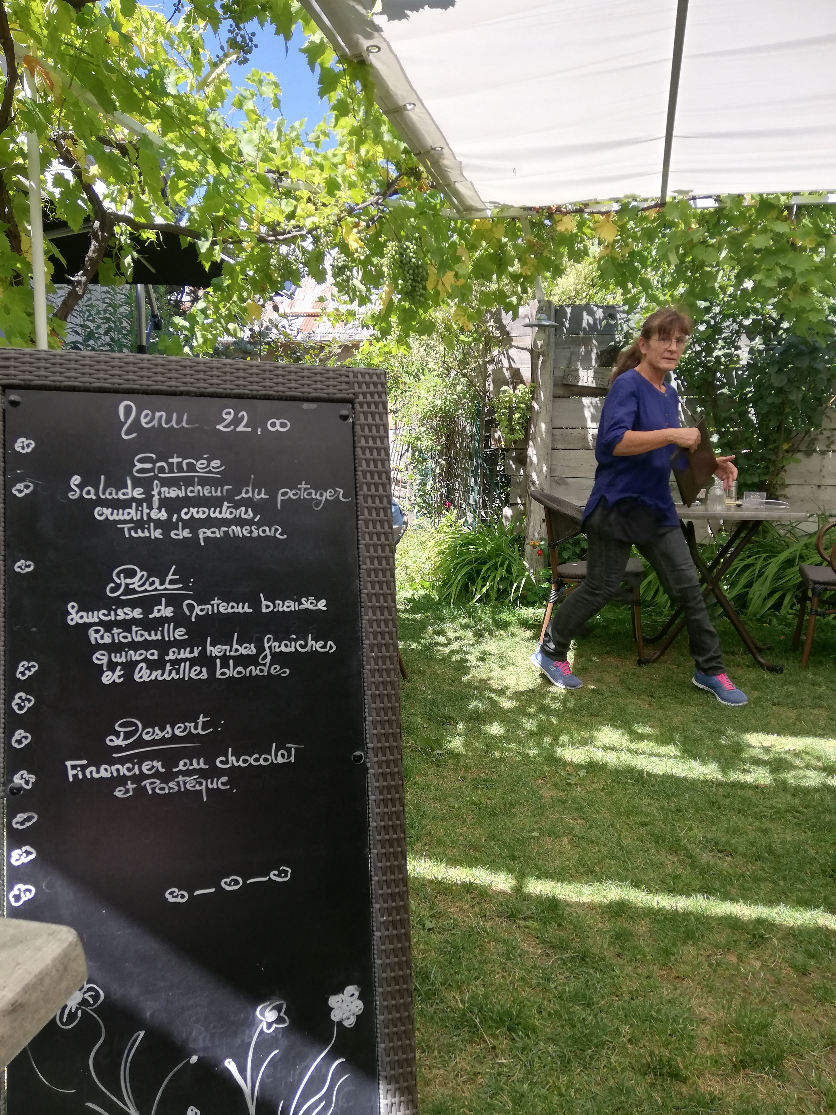Superbe accueil, on mange à l'arrière dans un petit jardin ombragé. Plat unique mais produits du jardin. Prix très correcte. Chien accepté