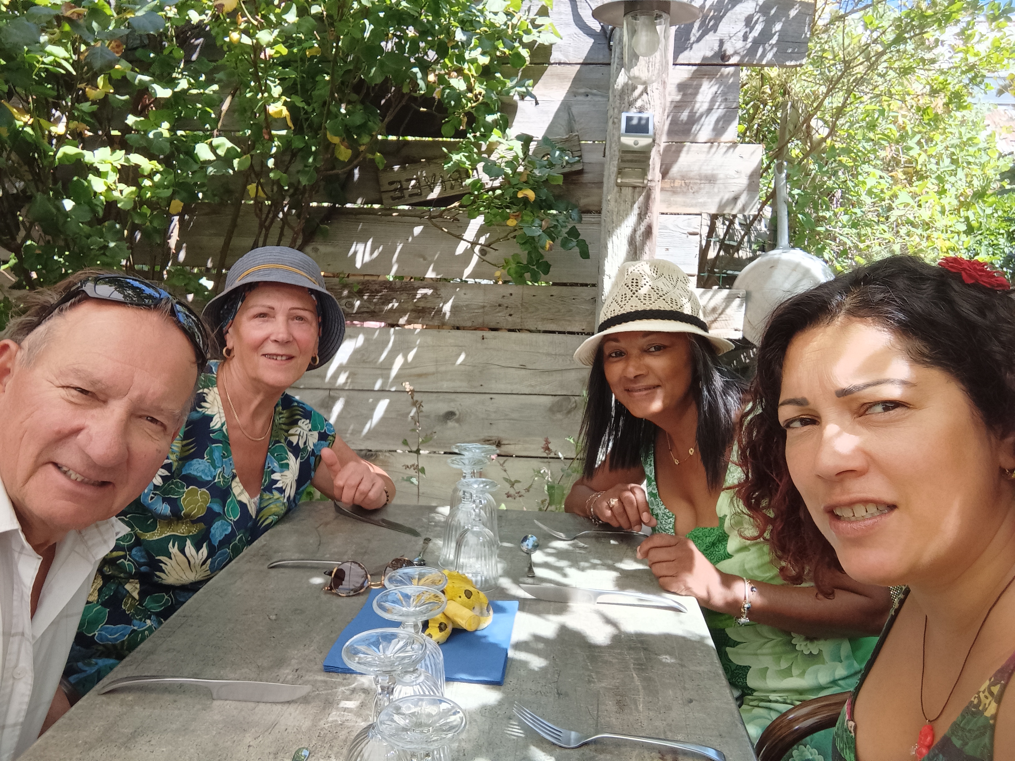 Déjeuner dans le jardin à l'ombre. Magnifique cuisine et très bonne. Ambiance avec service chaleureux et agréable.