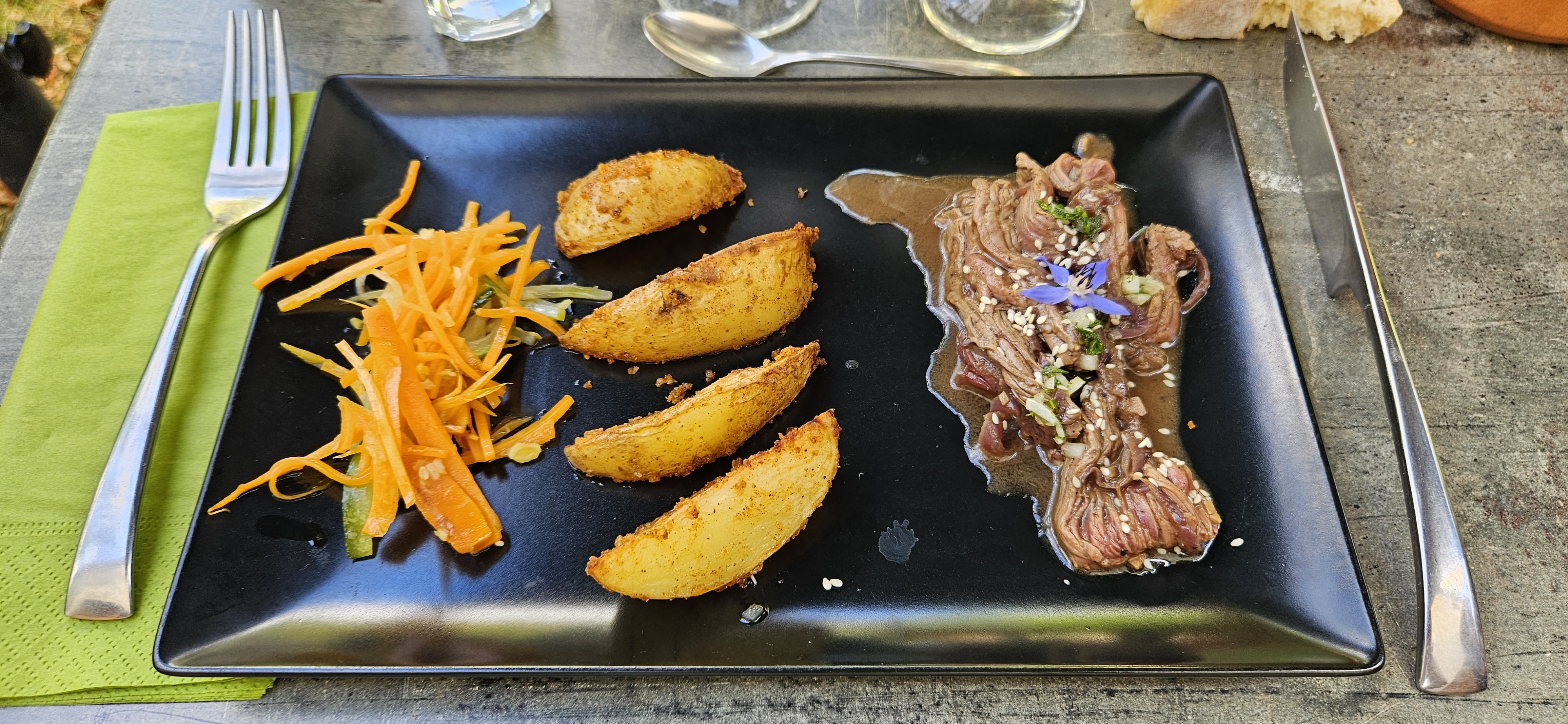 De très jolis plats au goût aussi bon que le visuel flatteur. La salle est installée sur la pelouse ce qui est très agréable et le personnel est souriant et travaille dans une bonne ambiance.