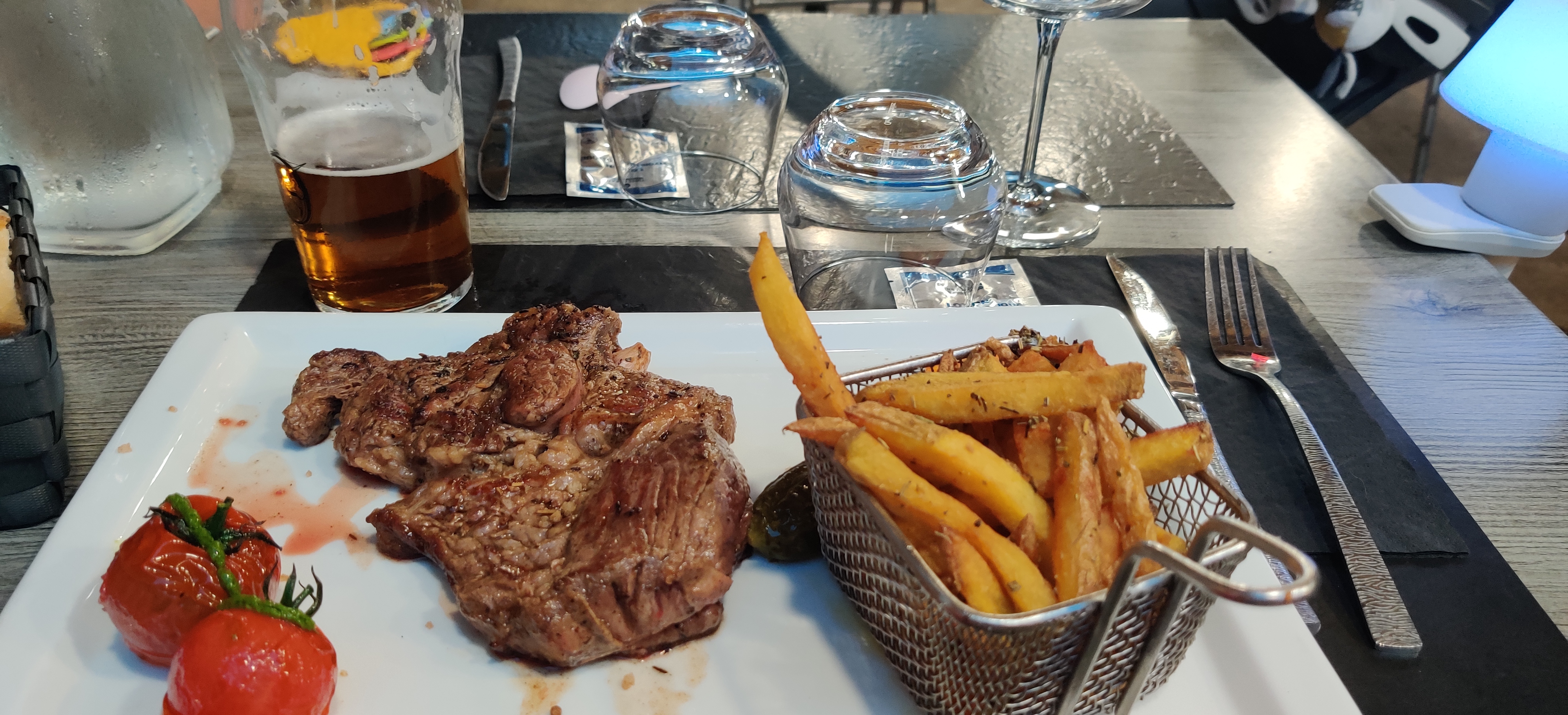 Déçu. J'ai commandé une entrecôte saignante. La carte indiquait 450g-500g. Au final, elle devait faire 200g, et fine comme du papier à cigarette par endroit, donc bien sûr trop cuite. En plus les frites étaient sèches et trop cuite également... bref très déçu J'ai quand même eu un rabais sur l'addition car la responsable a admis l'erreur...
