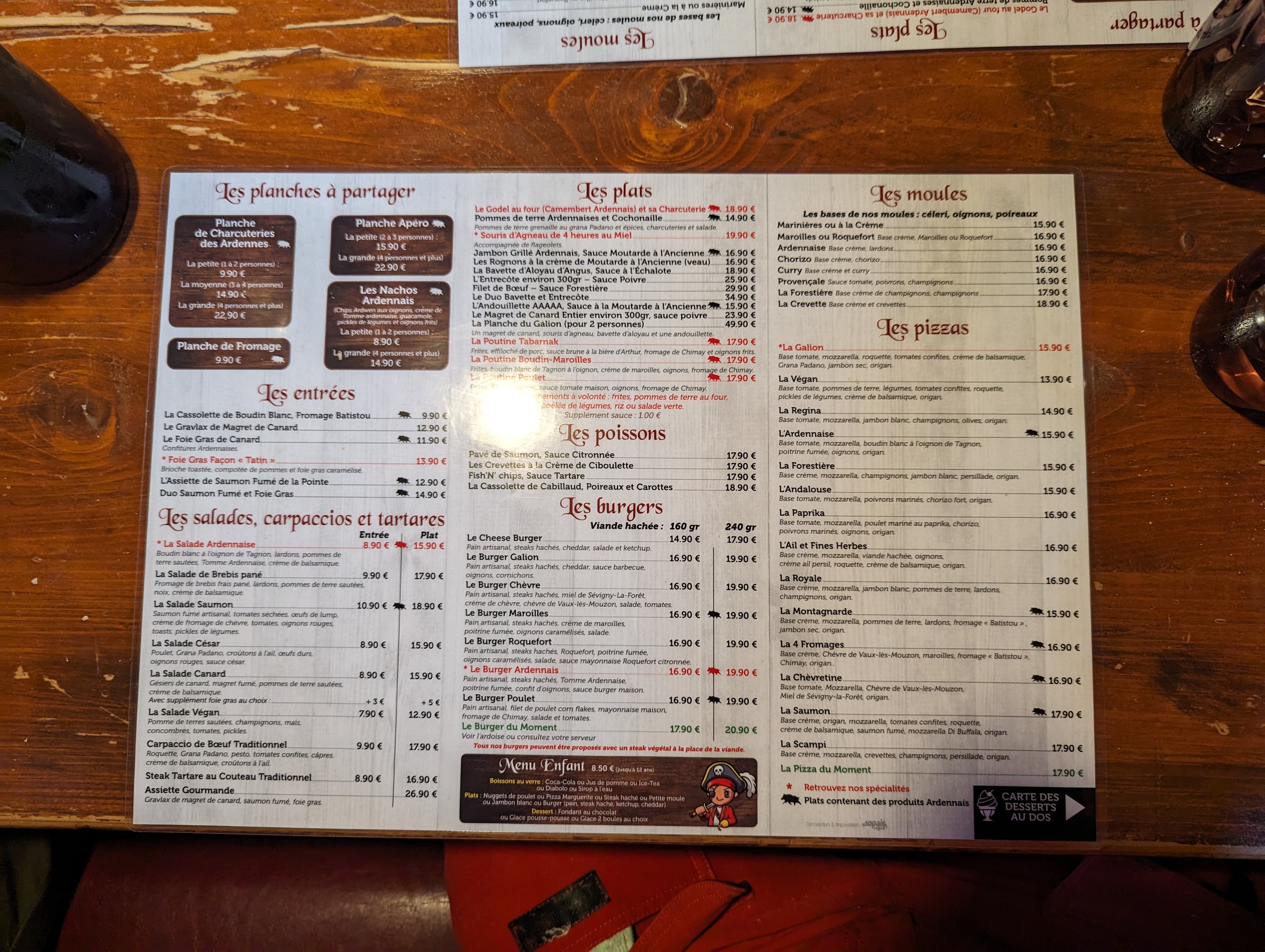 Tres bonne petite brasserie sur le thème des pirates, qui propose des plats avec produits ardennais. Tres bon service, assez rapide même en coup de feu. Nous voulions un endroit atypique pour notre fils qui adore les pirates. Il a été ravi! Cuisine bonne, salades bien fournies. Bref on a aimé