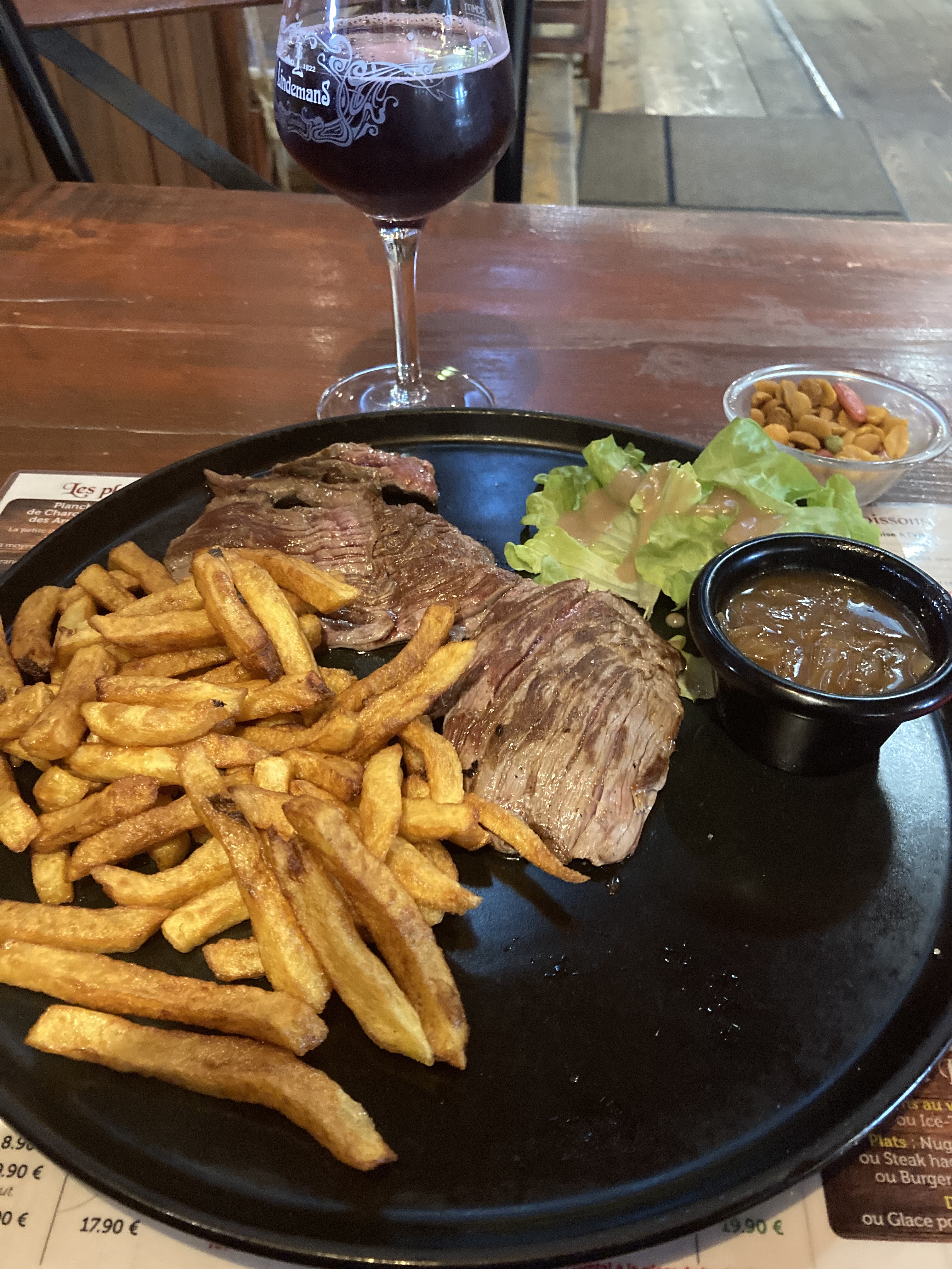 Je me suis régalé, beaucoup de restaurant devraient prendre exemple sur la qualité des produits servis. Les produits sont bien mis en valeur dans leurs assiettes. Je vous recommande: - deux bières rouge KASREEL 8%vol - Le foie gras en entrée. - Bavette en plat de résistance. - Dessert j'y ai pris une banana split accompagné d'un café. Résultats des courses 41.50€ J'y ai très bien mangé, super qualité de service je félicite toute l'équipe. Merci pour ce que vous faites.