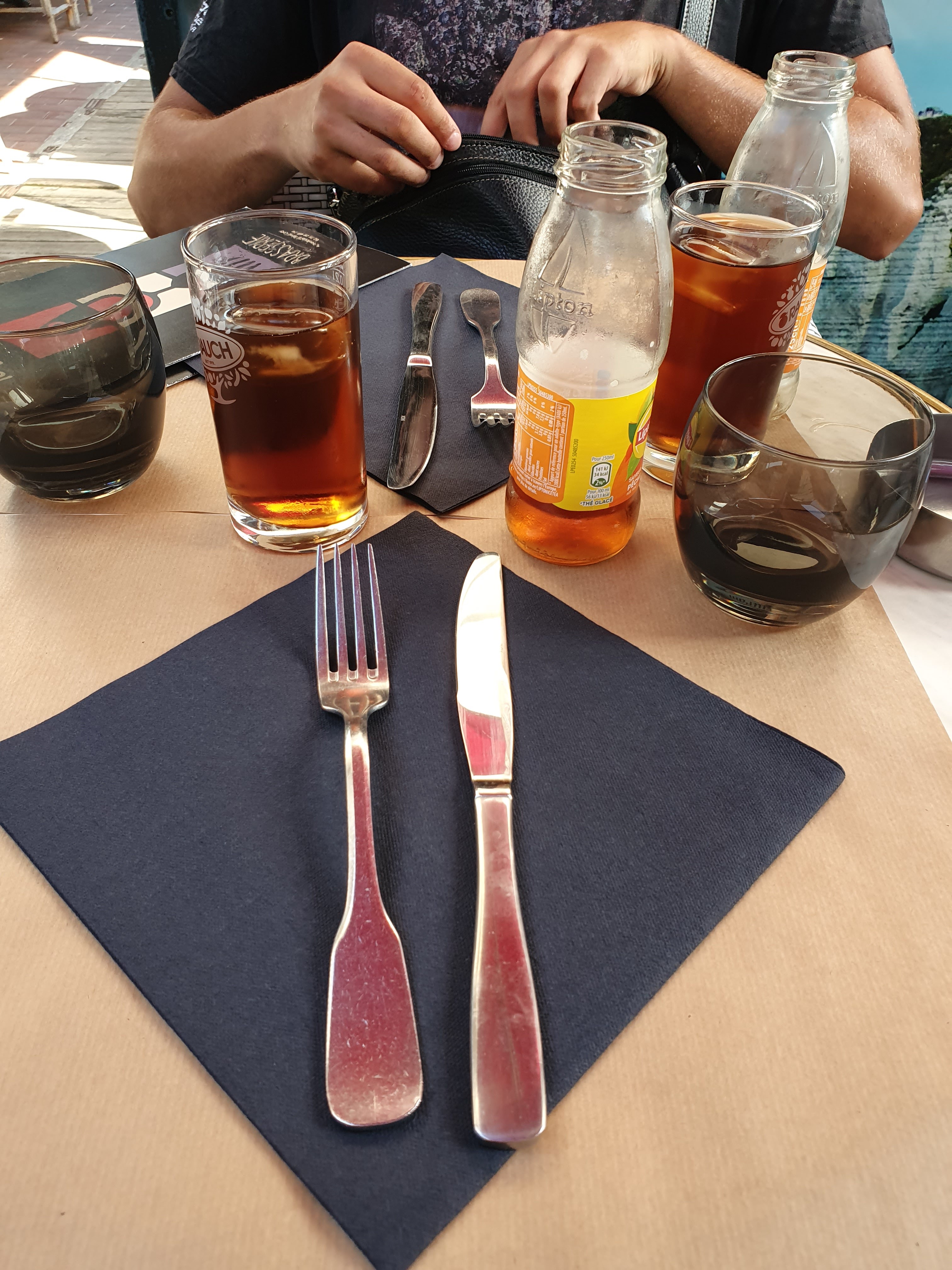 Petite table en terrasse sans la vue sur la mer ni de falaise Nous avons choisi ce restaurant pour le choix des plats, le Burger été succulent, et le poisson bien cuit avec sa sauce et sa ratatouille, les pâtes natures avec des feuilles de persil sont sans intérêt dont la manière ou elles sont préparer et présentés, il aurait mieu vallu un riz cuit dans un bouillon car le plat été très bon Pour les desserts, pana cotta avec pleins de coulis on a adoré et la crêpe Nutella avec une crêpe normande/bretonne très bonne ! Le chocolat chaud par contre !!! Une tasse style cappucino aurait suffit, c'était un peu trop même si je salut la générosité de la quantité ^^ Petits bémols : musique Maître Gims, Kendji en boucle toute la soirée et un peu fort... Pas de pain La terrasse en bois avec un défaut, des que quelqu'un passer derrière moi ou se lever ou s'assied, la planche sous ma chaise plier et j'ai tanguer tout le repas Pas de carafe d'eau malgré les verres à eau apporter à table lors de notre installation 2 icetea en + le tout pour 70 euros pour 2. Un peu cher, serveur gentil